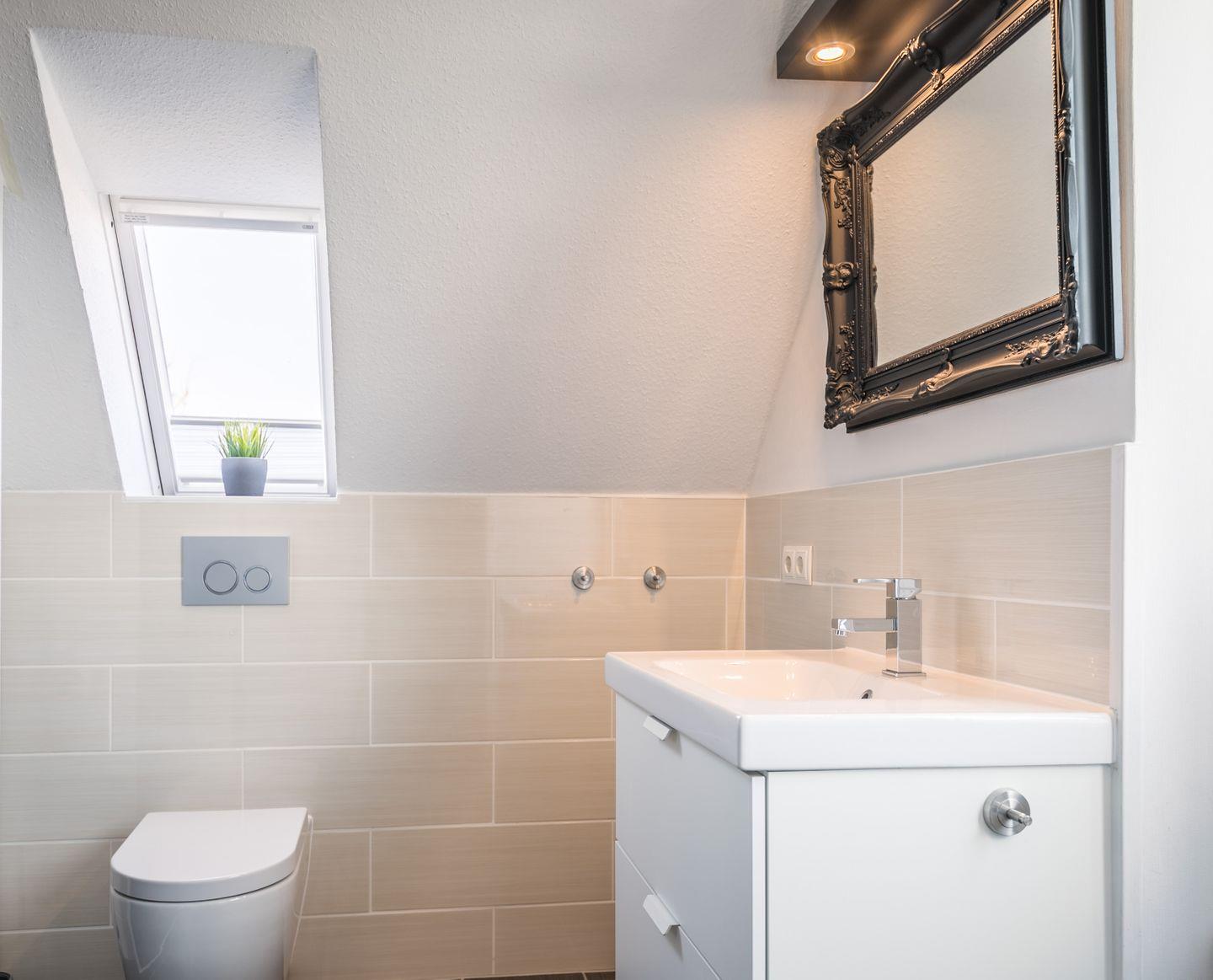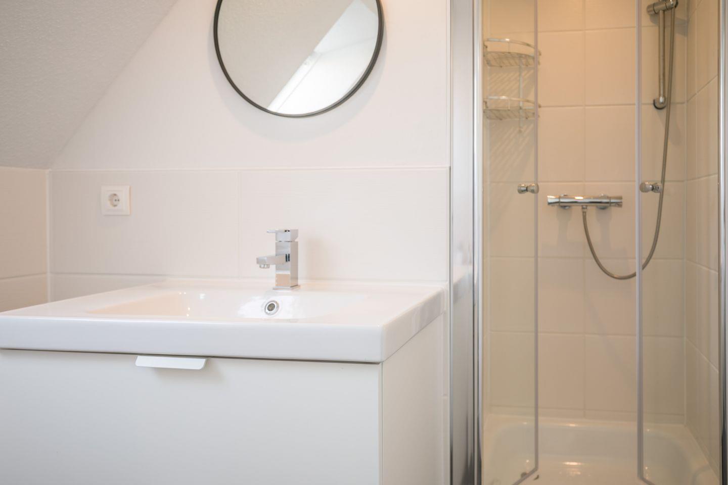 Von beiden Schlafzimmern gelangen Sie je in ein Tageslichtduschbad. In einem der Bäder finden Sie eine extra große Regendusche.