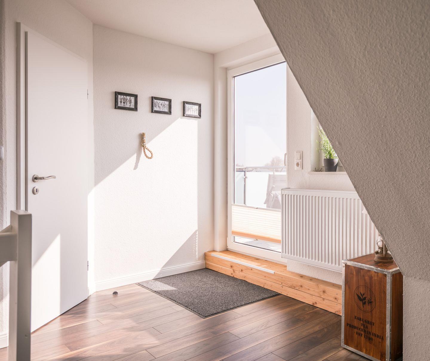 Sie erreichen dieses Apartment über eine Treppe im 1. Obergeschoss. Am Treppenaufgang befindet sich ein kleiner Vorflur und eine Garderobe.