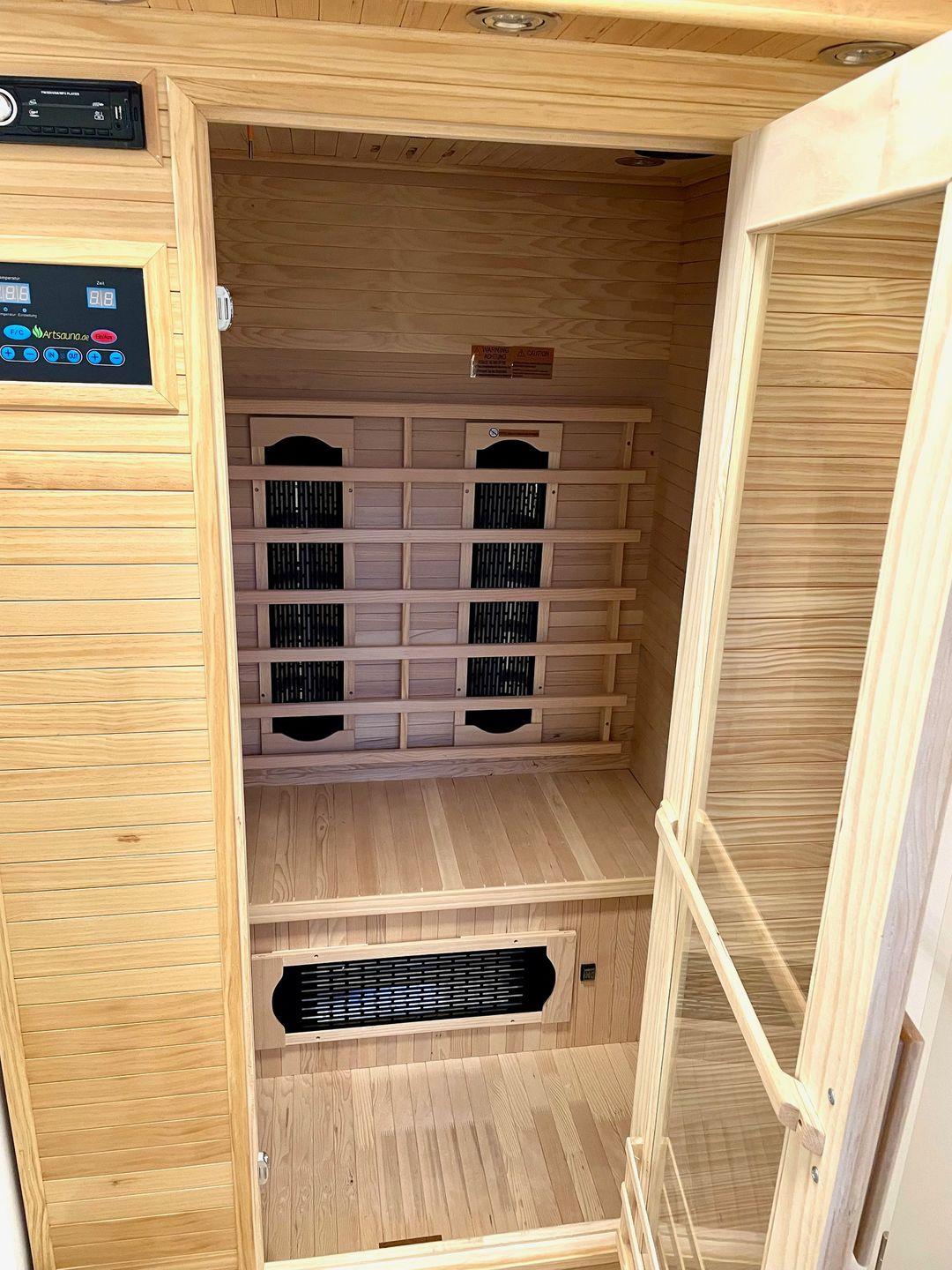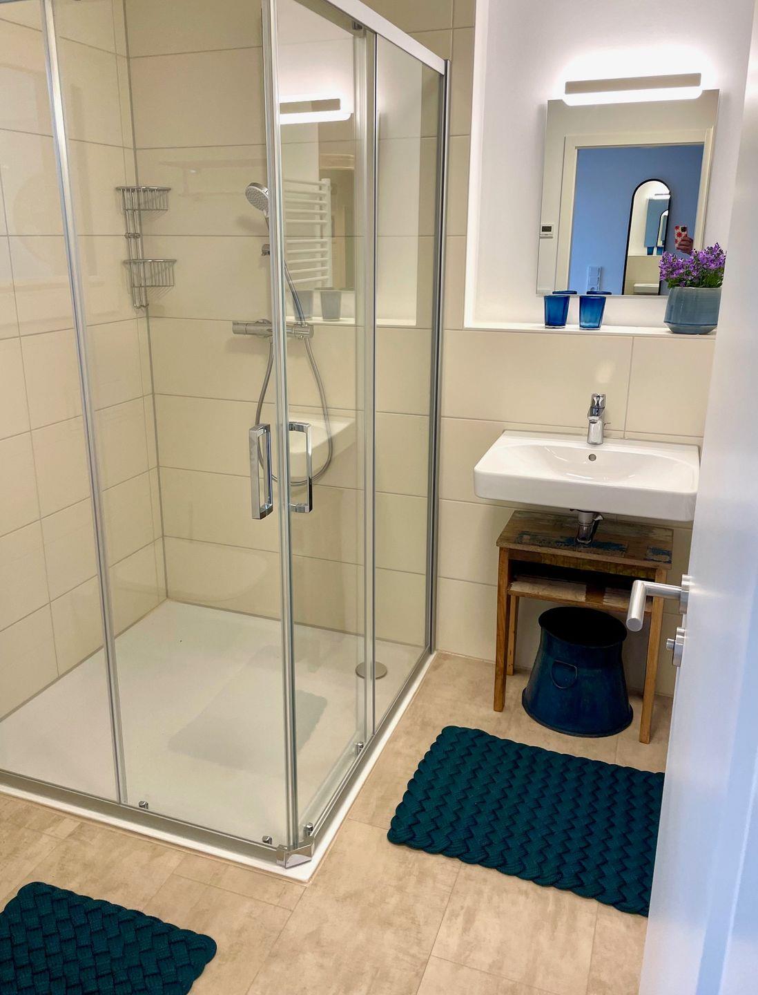 Das Badezimmer ist mit einer ebenerdigen Dusche, einem Kosmetikspiegel, einem Föhn und einem Handtuchtrockner ausgestattet. Das absolute Highlight ist die Infrarotsauna – perfekt für pure Erholung nach langen Strandspaziergängen oder um dem Alltagsstress zu entfliehen und tief zu entspannen.