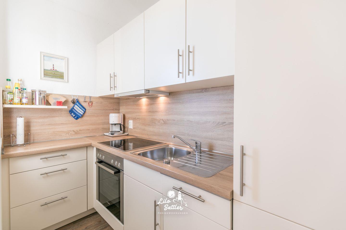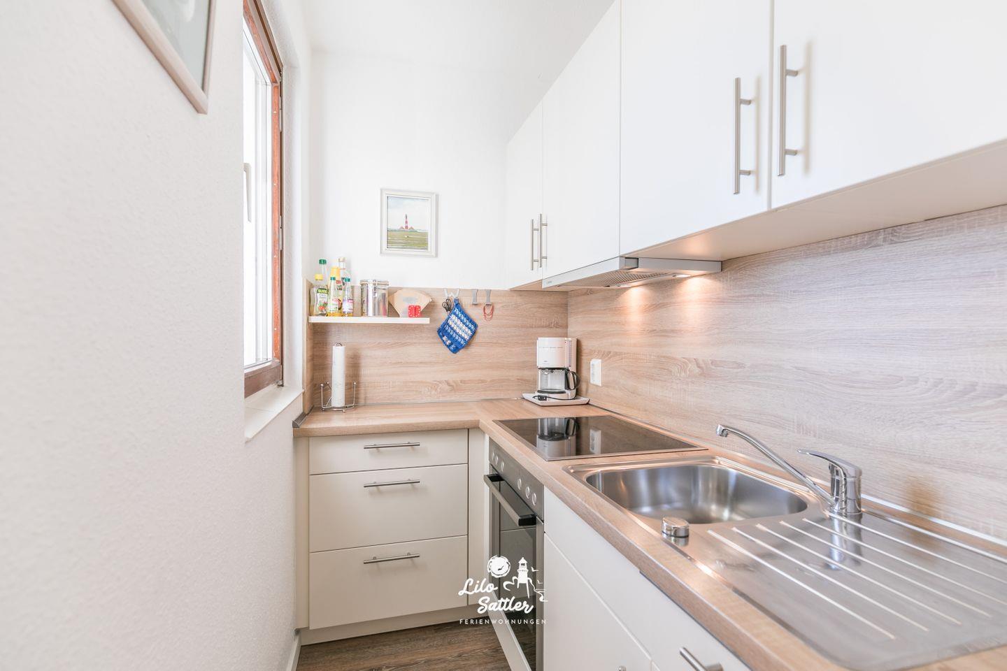 gut ausgestattete neuwertige Küche mit reichlich Stauraum, Herd mit Ceranfeld, Backofen und Dunstabzug, Kühlschrank mit Gefrierfach, Geschirrspüler, Kaffeemaschine, Wasserkocher, Eierkocher, Toaster, Fenster