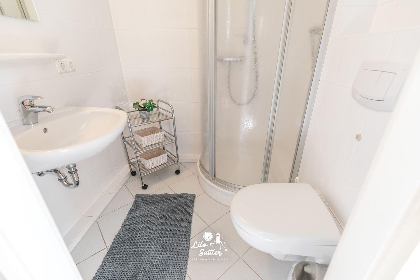 Dusche, Waschbecken, Toilette, Spiegel, Föhn, Regal, Lüfter