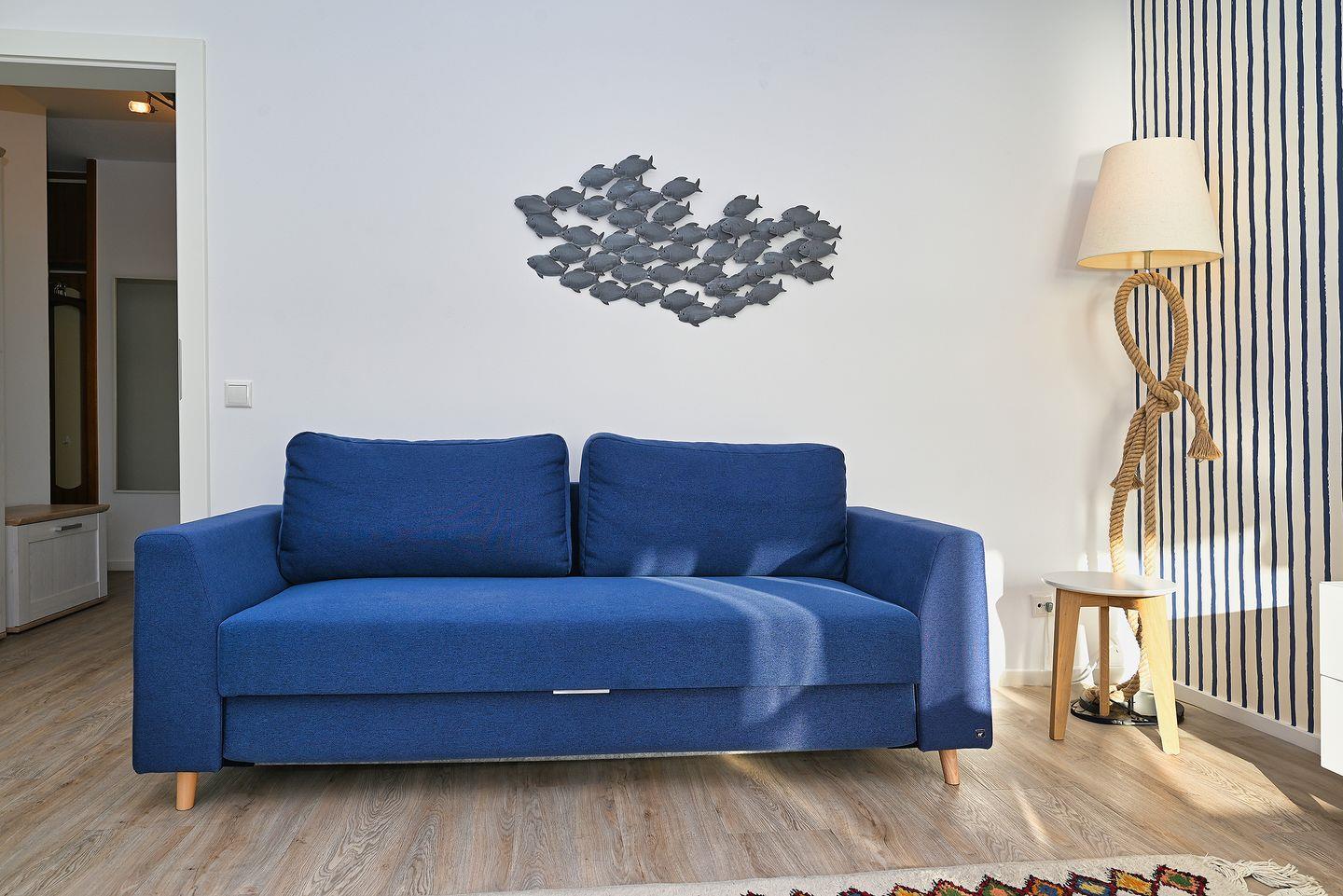 Zwei Personen schlafen im Schlafzimmer mit Doppelbett, zwei auf dem gemütlichen Schlafsofa im Wohnzimmer. Von beiden Zimmern aus können Sie den Blick auf die Nordsee genießen.