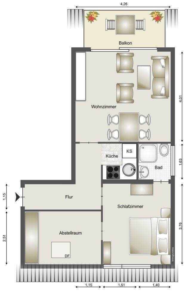 Hinweis: Bitte beachten Sie, dass das Badezimmer nur über das Schlafzimmer zugänglich ist. Die Wohnung ist daher besonders gut für Familien mit einem Kind