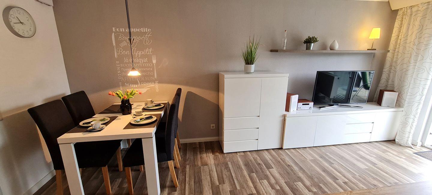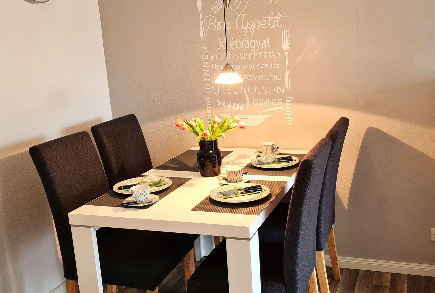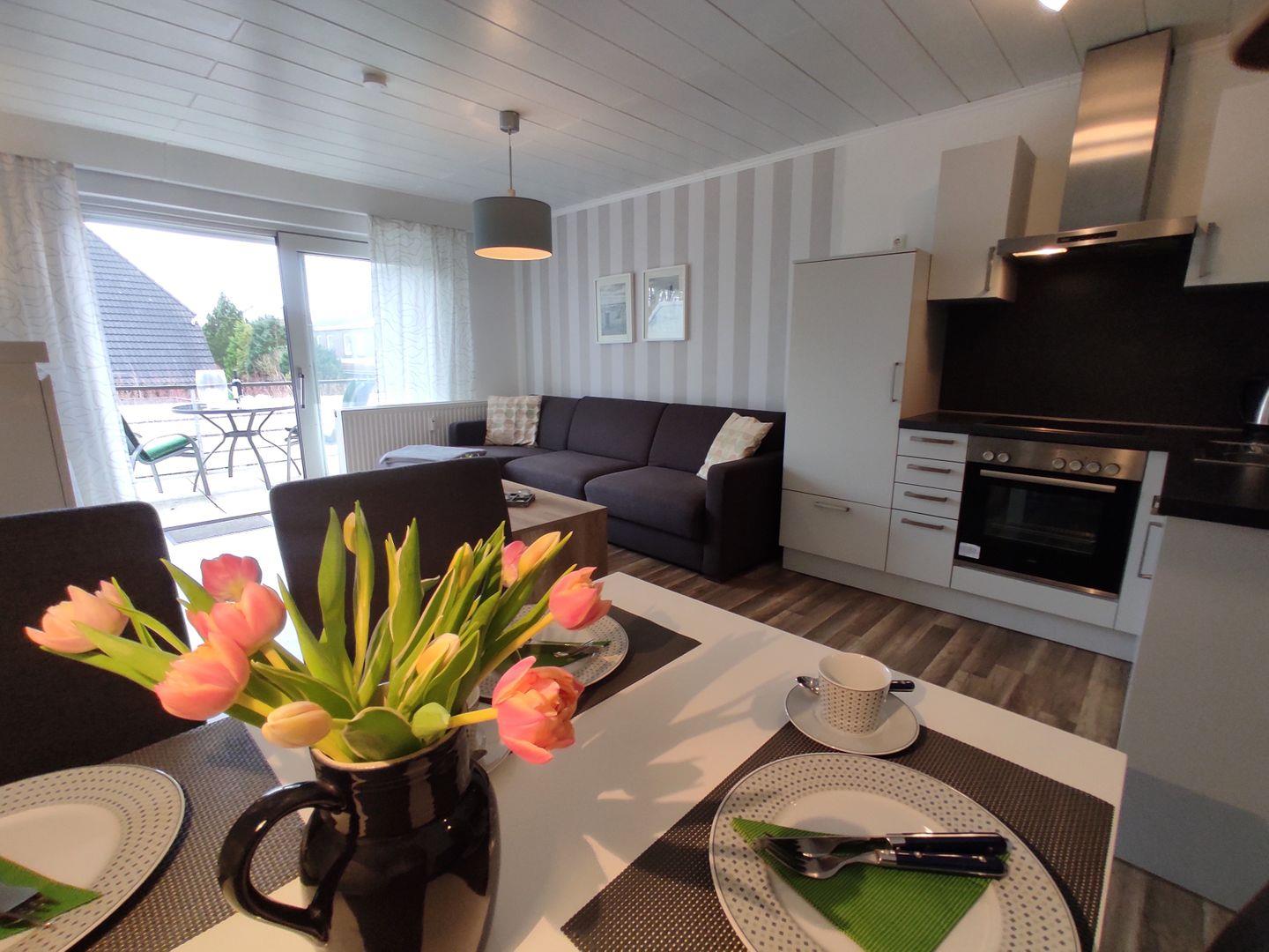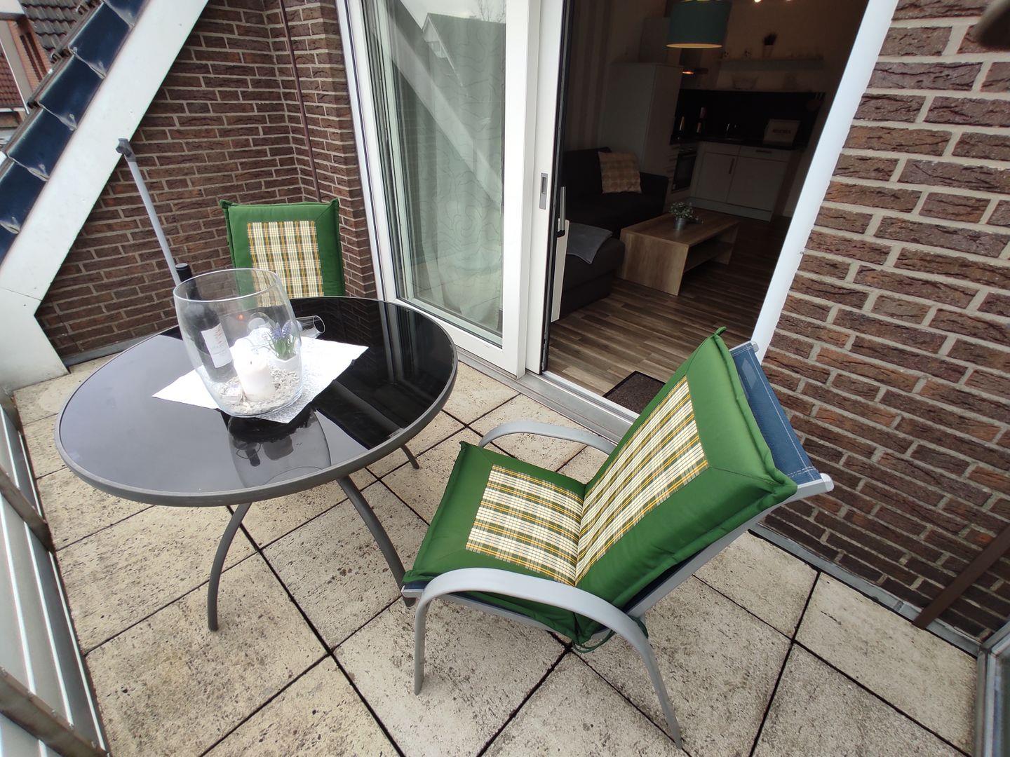 Ihre zubereiteten Speisen können Sie am Esstisch im Wohnraum oder auf dem Balkon, der von morgens bis in den späten Nachmittag hinein Sonne bietet, zu sich nehmen und dabei die herrliche Nordseeluft genießen.