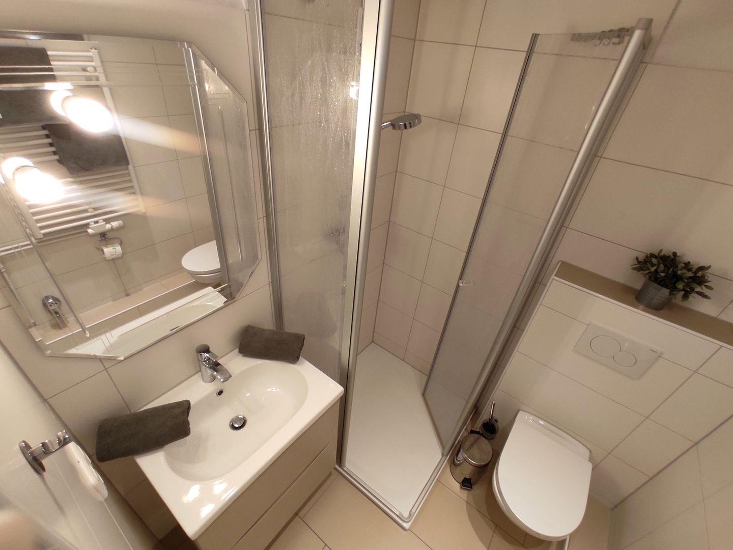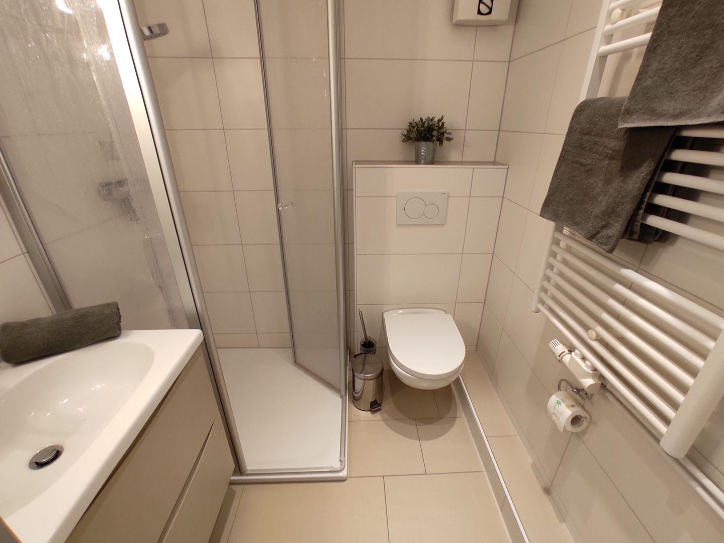 Das innenliegende Badezimmer verfügt über eine Dusche mit niedrigem Einstieg und einen Handtuchwärmer.
