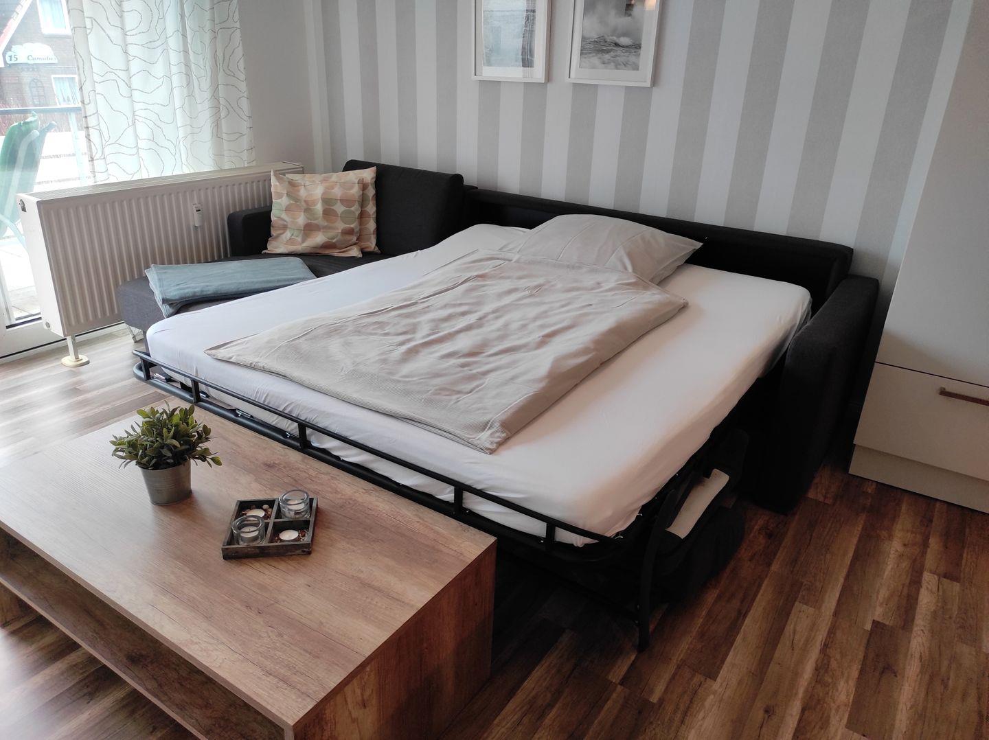 Im Wohnzimmer steht für Sie ein gemütliches Sofa bereit, welches zu einer großen Schlafgelegenheit (1,80x 2m, mit Lattenrost und durchgehender Matratze) für eine Person umgebaut werden kann. In diesem Raum gibt es eine elektrische Außenjalousie.