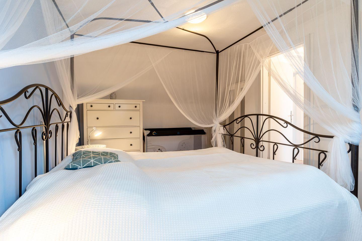 In der zweiten Etage befinden sich zwei Schlafzimmer, eines mit einem gemütlichen Doppelbett und das andere mit zwei Einzelbetten. Eine zusätzliche geschlossene Toilette mit Handwaschbecken steht ebenfalls zur Verfügung.
