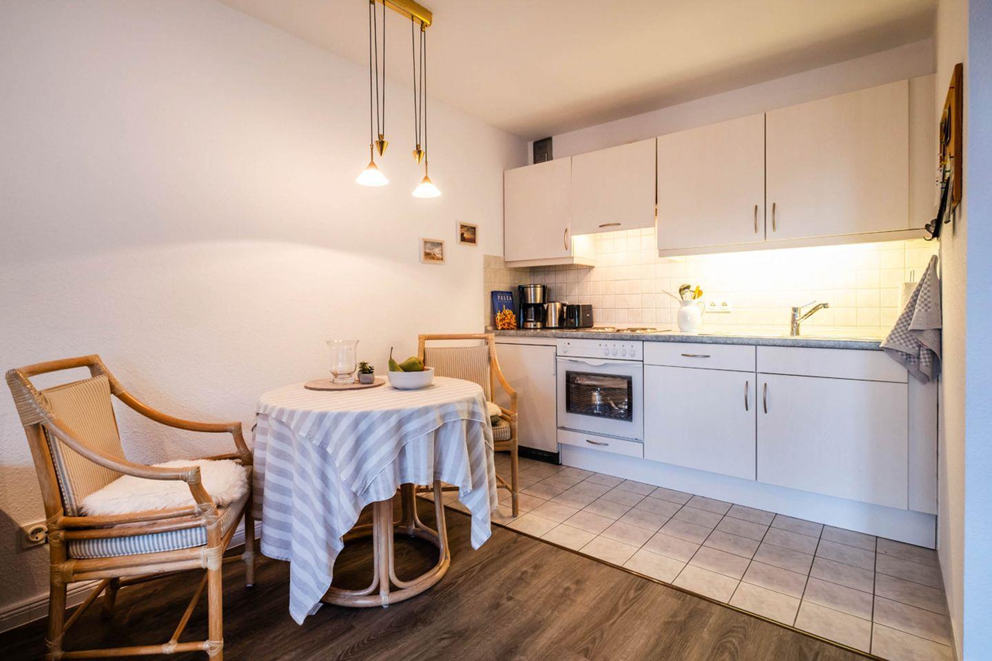 Mitte Februar 2026 wird in der Wohnung eine neue Küche mit Geschirrspüler verbaut. Ein gemütlicher Essbereich im Wohnzimmer lädt zu gemeinsamen Mahlzeiten und geselligen Abenden ein.