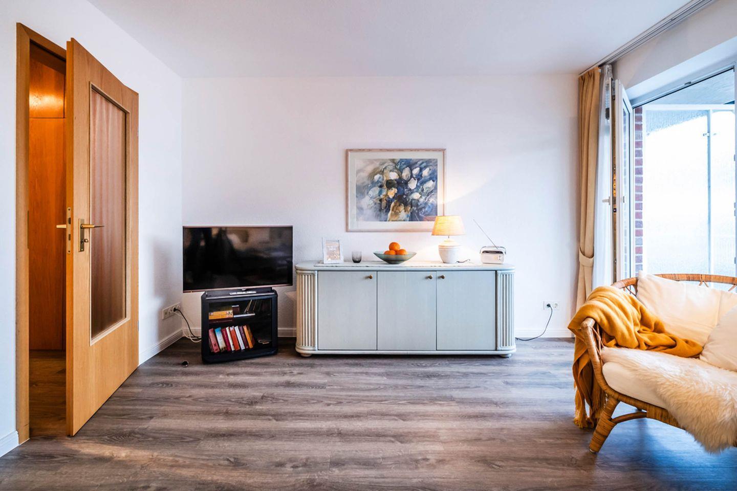Die Wohnung liegt im ersten Stock und ist bequem mit dem Aufzug erreichbar, was sie auch für mobilitätseingeschränkte Gäste attraktiv macht. WLAN, ein Fernseher und eine HiFi-Anlage stehen Ihnen zur Verfügung, um auch während Ihres Urlaubs bestens unterhalten zu sein. Genießen Sie entspannte Stunden auf Ihrem privaten Balkon, der zum Verweilen einlädt, oder machen Sie es sich im gemütlichen Wohnzimmer bequem.