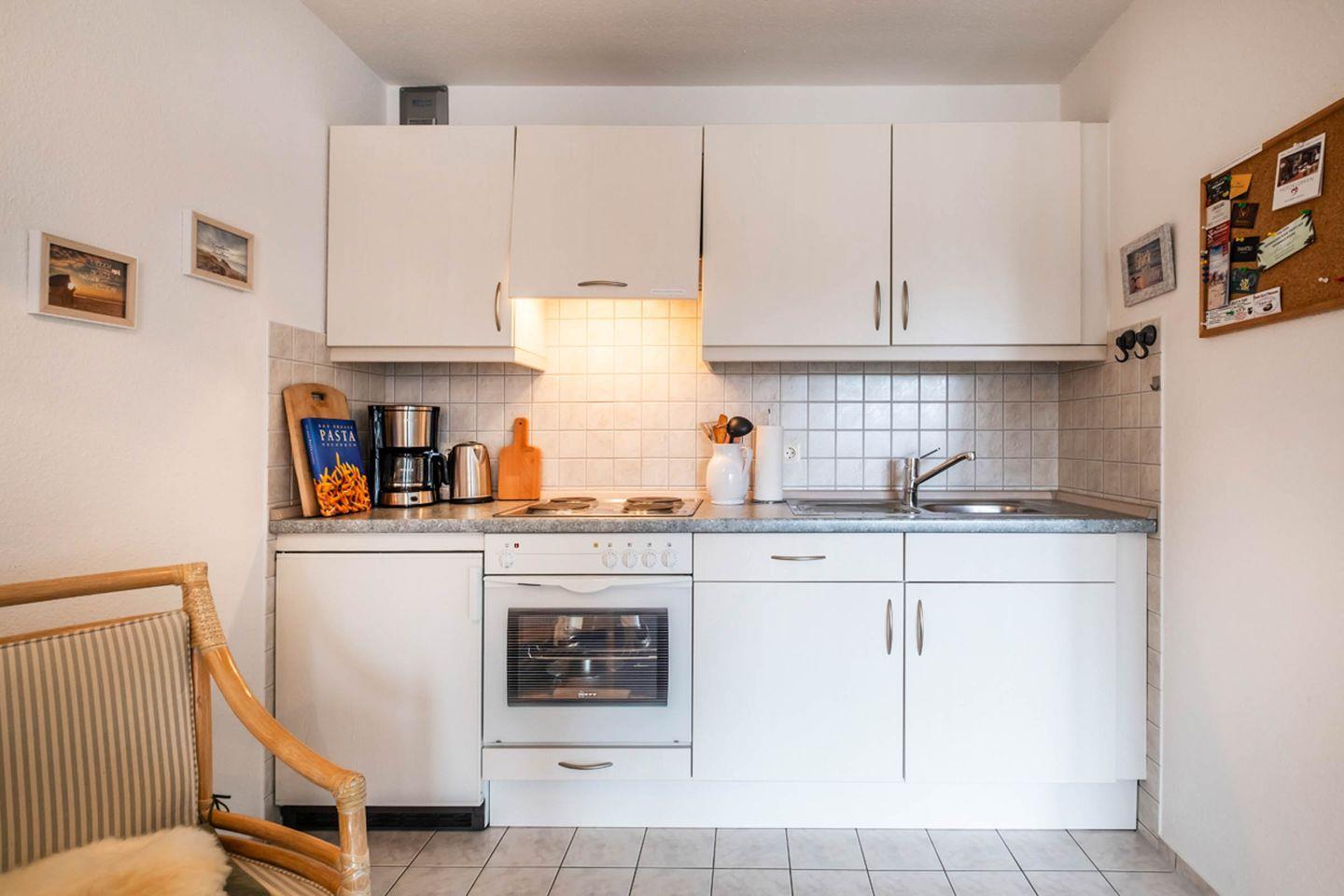 Die Wohnung überzeugt durch ein stilvolles und offenes Raumkonzept, das das Wohnzimmer mit einer Küchenzeile verbindet. Hier können Sie Ihre Lieblingsgerichte mit frischen Zutaten aus den nahegelegenen Supermärkten zubereiten. Ausgestattet mit einem 4-Platten-Herd, Mikrowelle, Backofen sowie Kühlschrank und Gefrierfach und Spülmaschine lässt die Küche keine Wünsche offen.