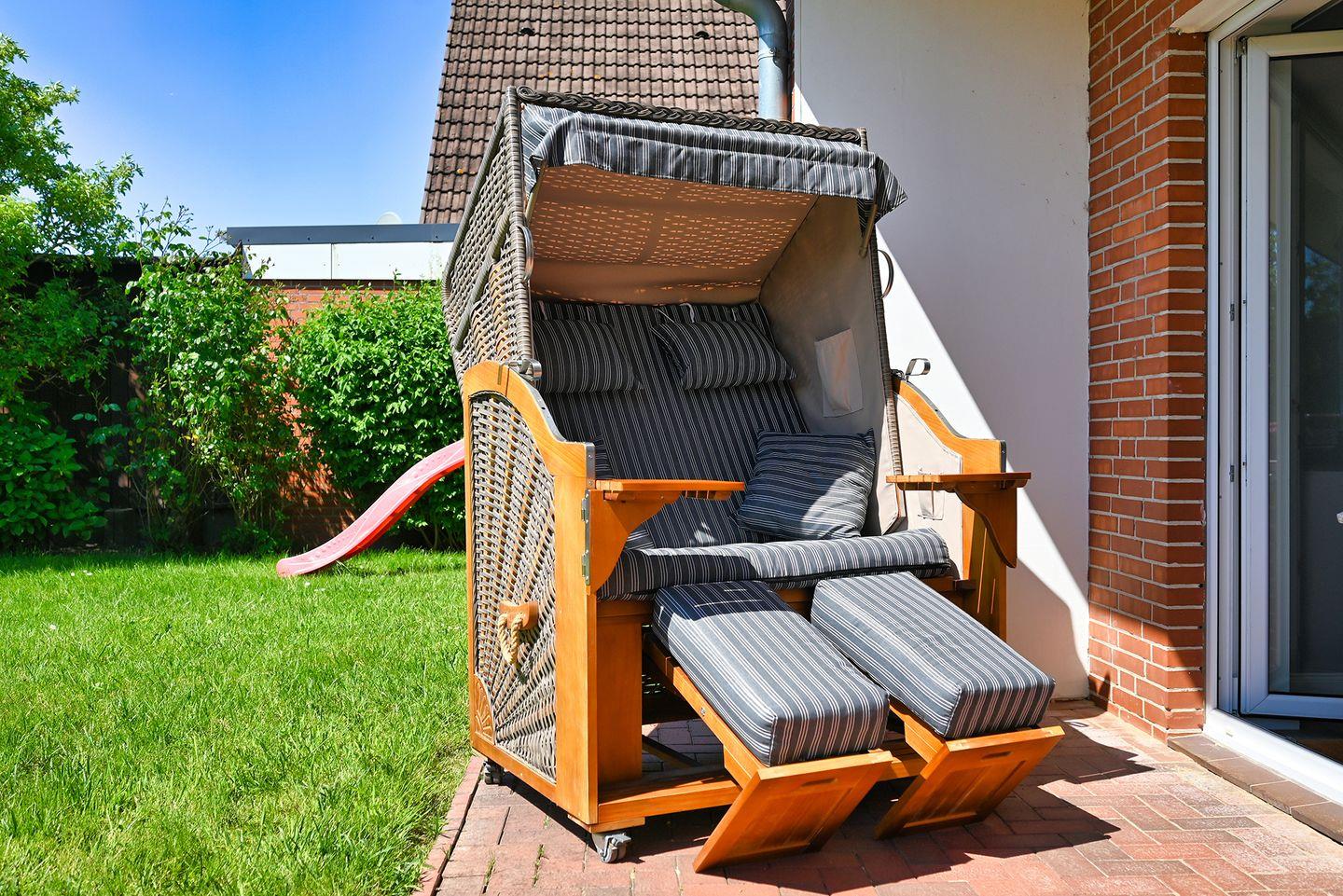 Das Highlight der Wohnung ist der Garten für entspannte Stunden. Sie bietet eine schöne Terrasse mit Gartenmöbeln und einem Strandkorb. An die Kinder wurde auch gedacht: Hier finden Sie einen Schaukel sowie eine Rutsche die Kinderherzen höher schlagen lässt.