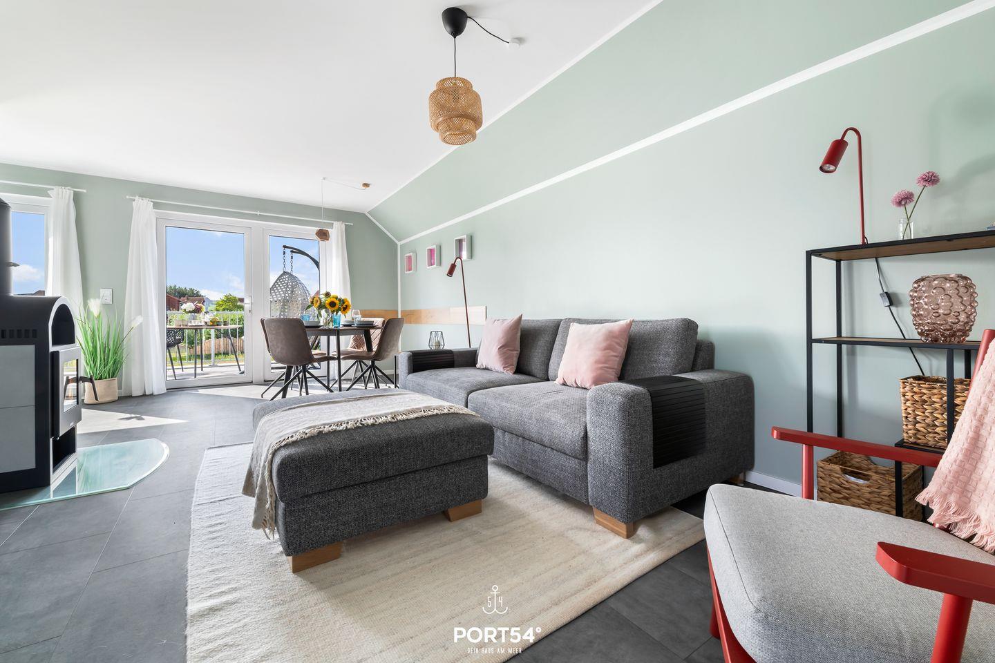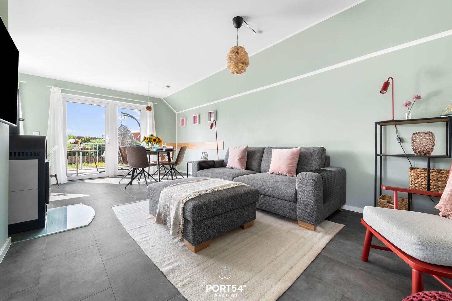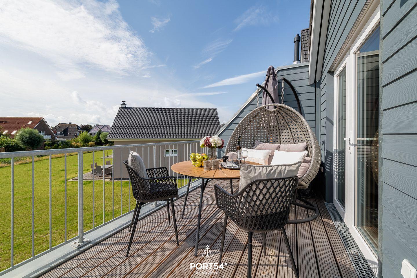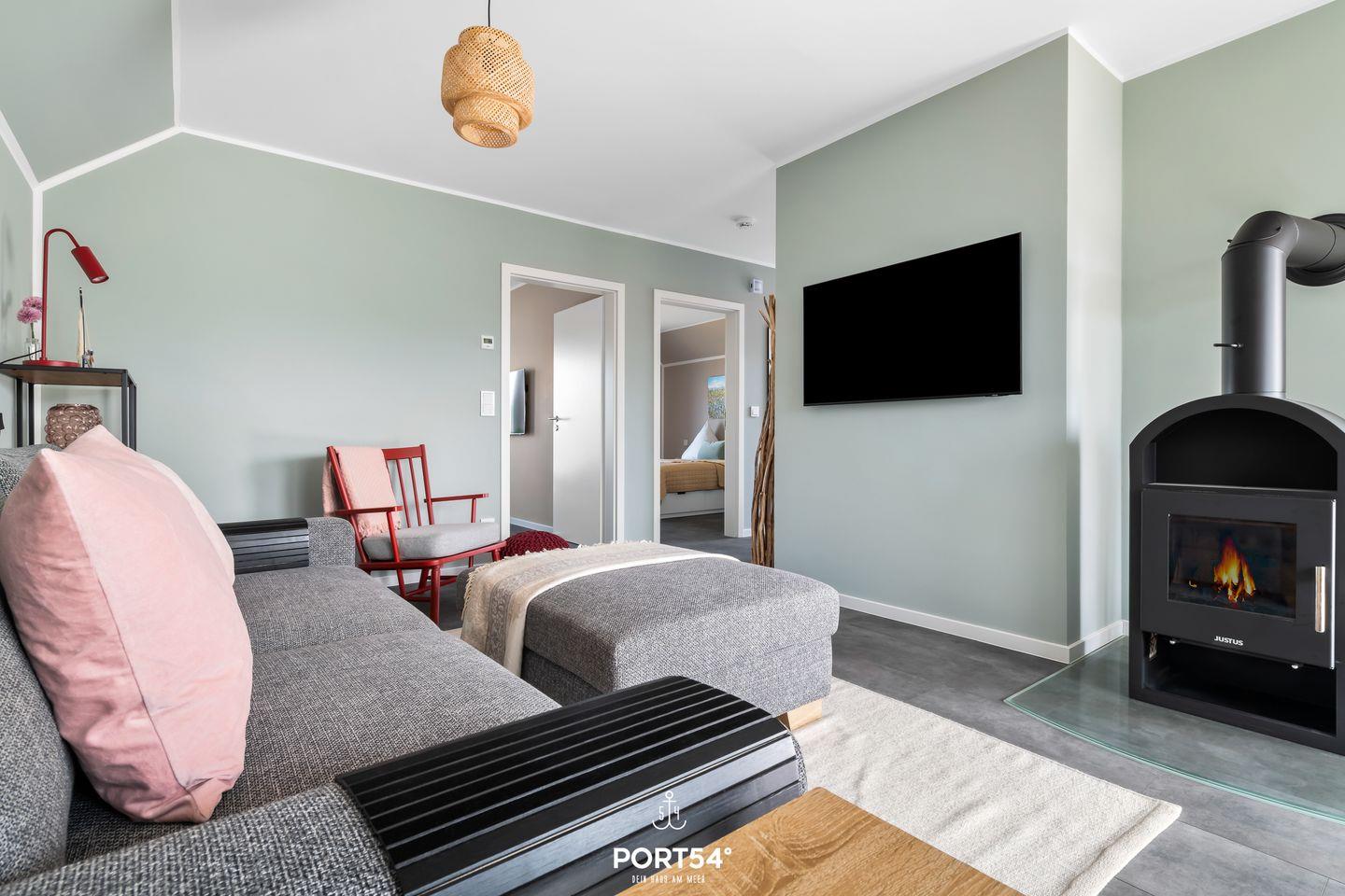 Modernes Ferienapartment in Büsum mit Kamin, Infrarotsauna und möbliertem Balkon für entspannte Nordseeaufenthalte.