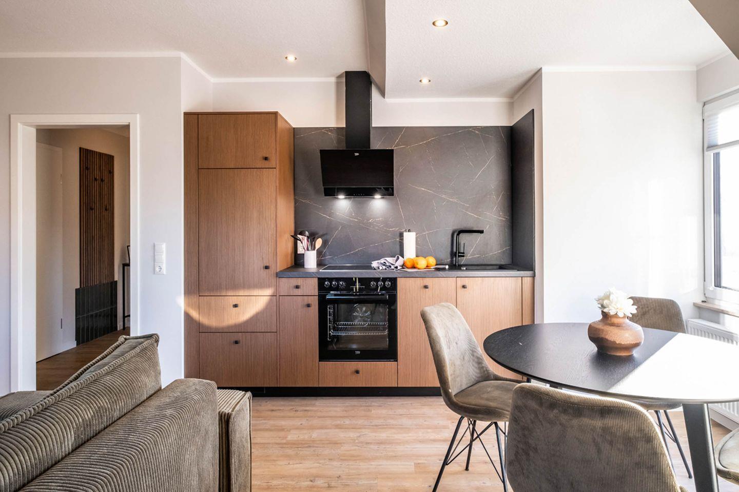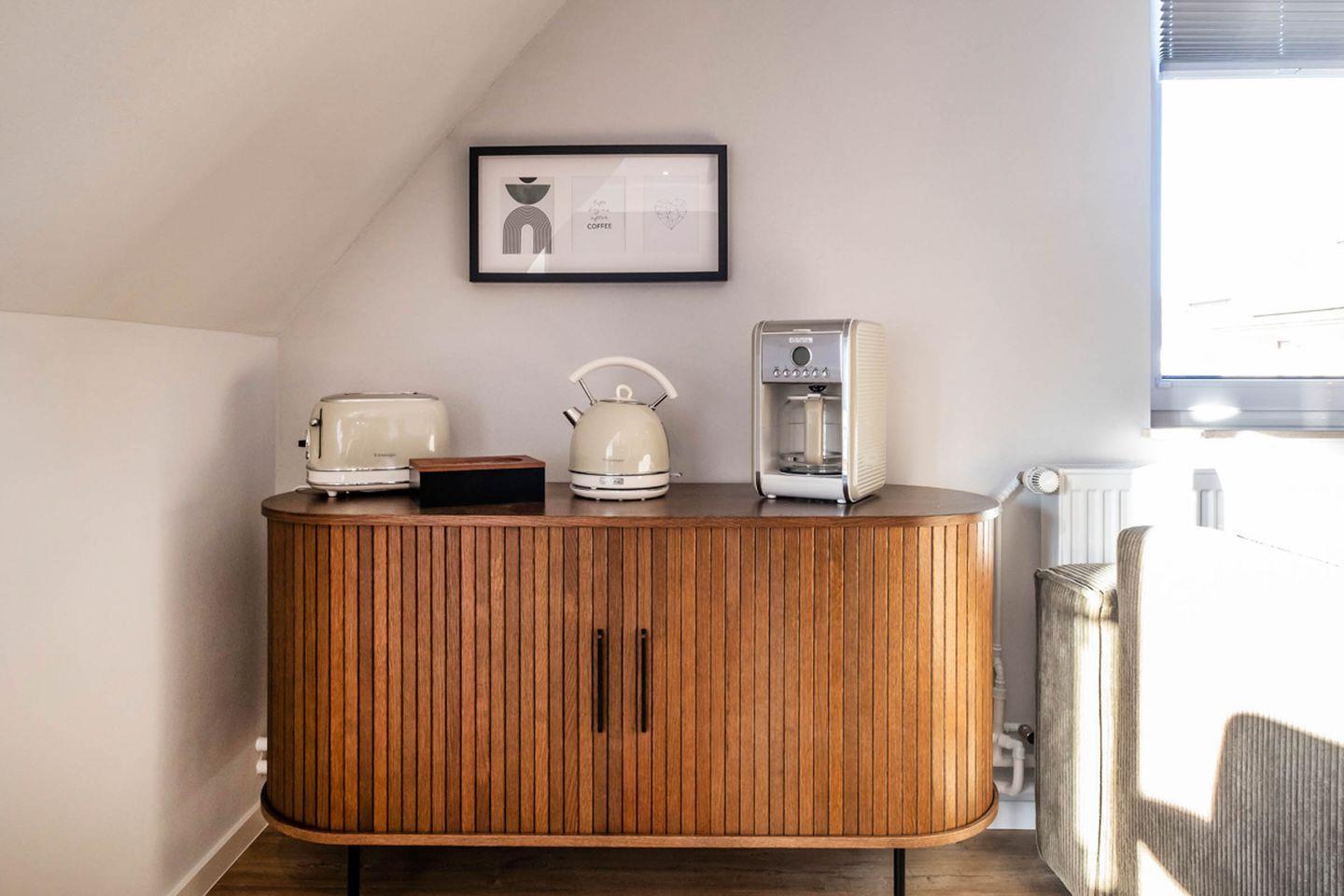 Küchenzeile: Geschirrspüler, Kochfeld, Backofen, Kühlschrank mit Gefrierfunktion, Heißwasserkocher, Kaffeemaschine, Toaster.