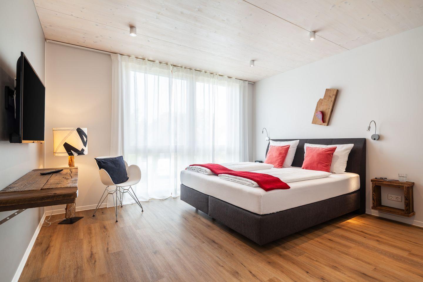 Boxspringdoppelnett mit durchgehender Matratze (180x200cm), Nachttische + Lampen, Kleiderschrank, Flachbild-TV, Fliegengitter