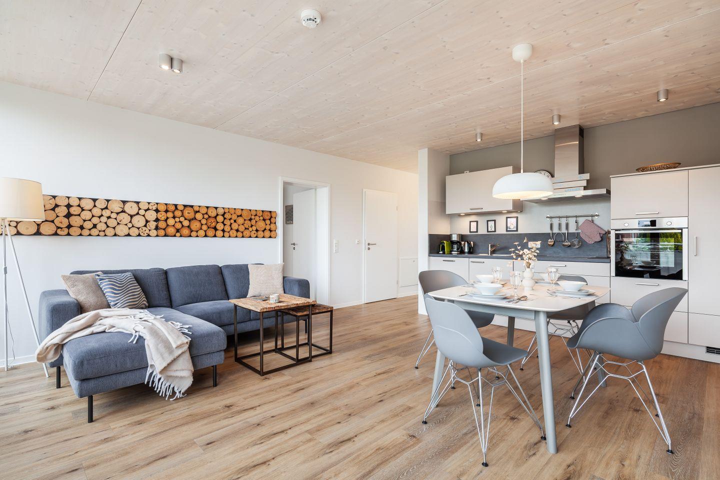 Im Architektenhaus Best Büsum wohnen Sie in der Wohnung Ebbe komfortabel und mit viel Platz – nah am Binnen-Deich, zentral und nur wenige Minuten zu Hafen, Bahnhof, Einkauf und Stadtzentrum. Der helle Wohn-/Essbereich öffnet sich zum Balkon; hier beginnt der Tag mit Nordseeluft und endet beim entspannten Sundowner mit Blick ins Grüne.