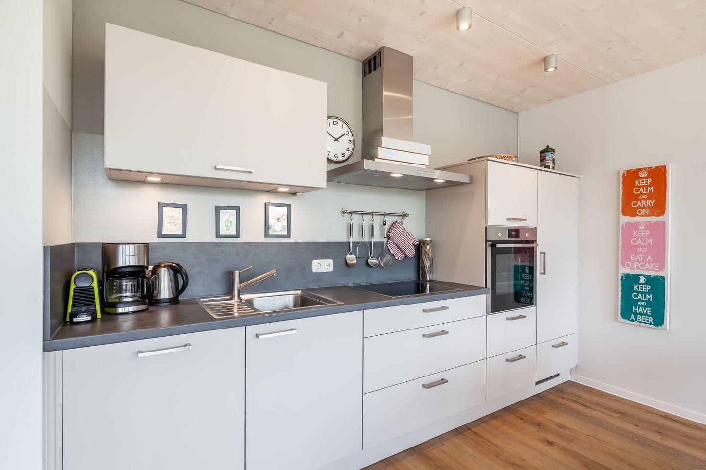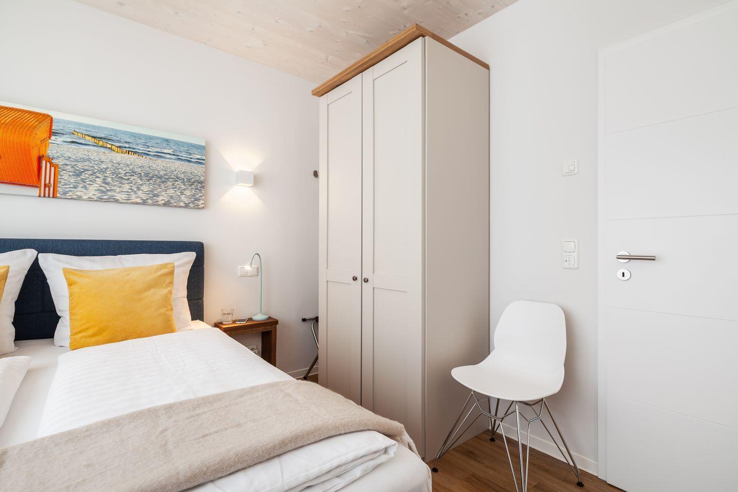 Zwei Schlafzimmer mit TV bieten ruhige Rückzugsorte, das Duschbad mit ebenerdiger Dusche und Fußbodenheizung sorgt für einen angenehmen Start in den Urlaubstag. Die Küchenzeile ist hochwertig ausgestattet – ideal für das schnelle Frühstück ebenso wie für den gemütlichen Kochabend nach Strand und Hafenbummel.