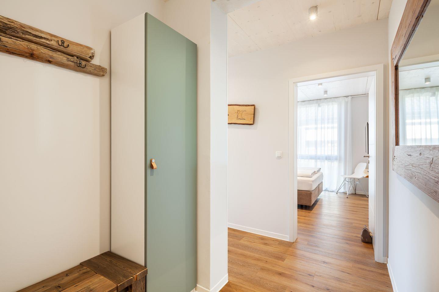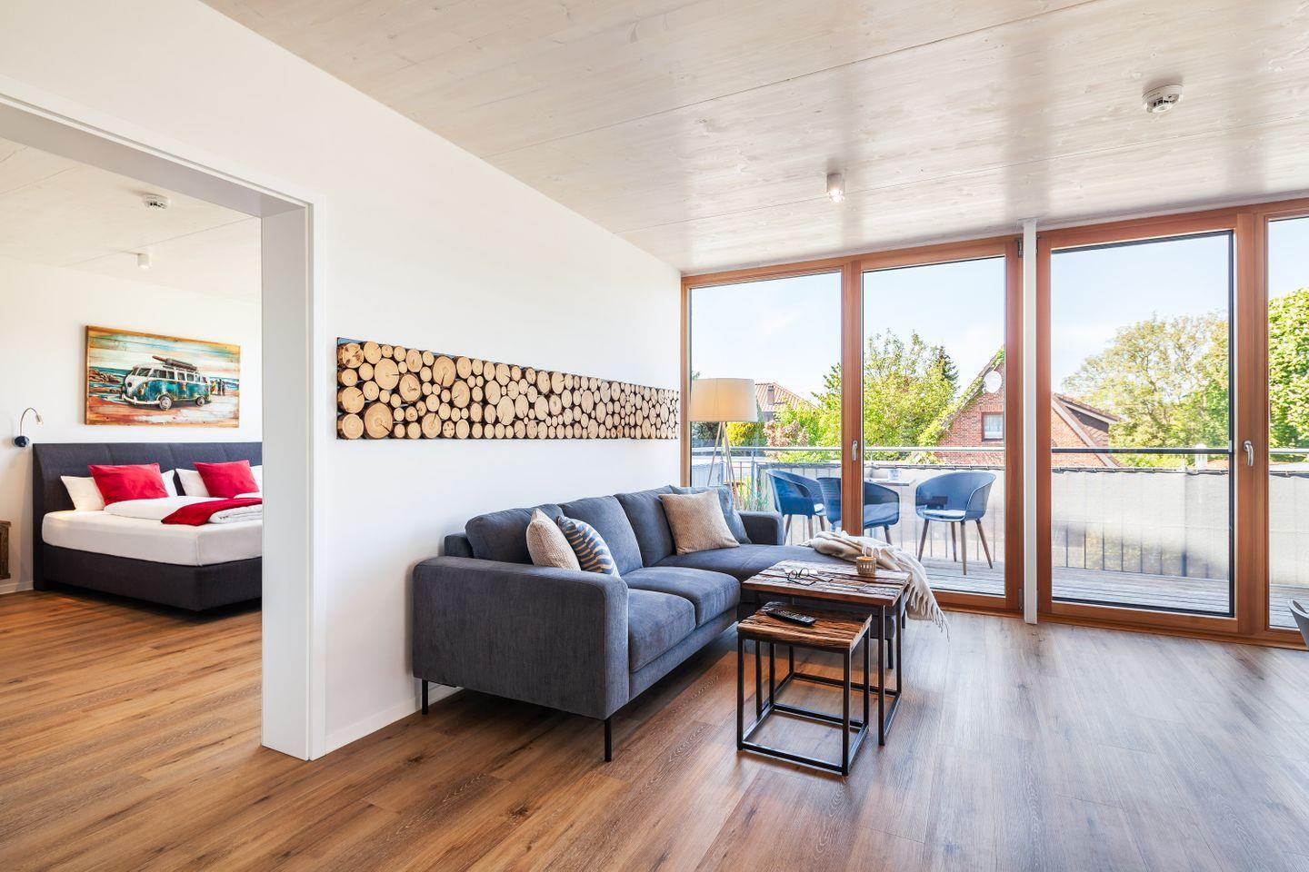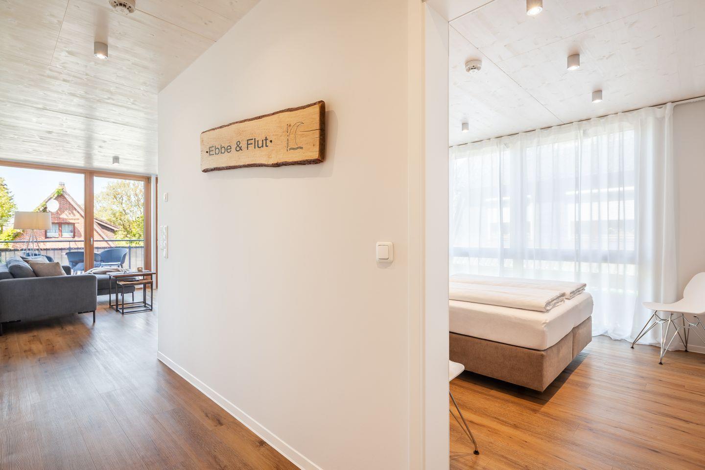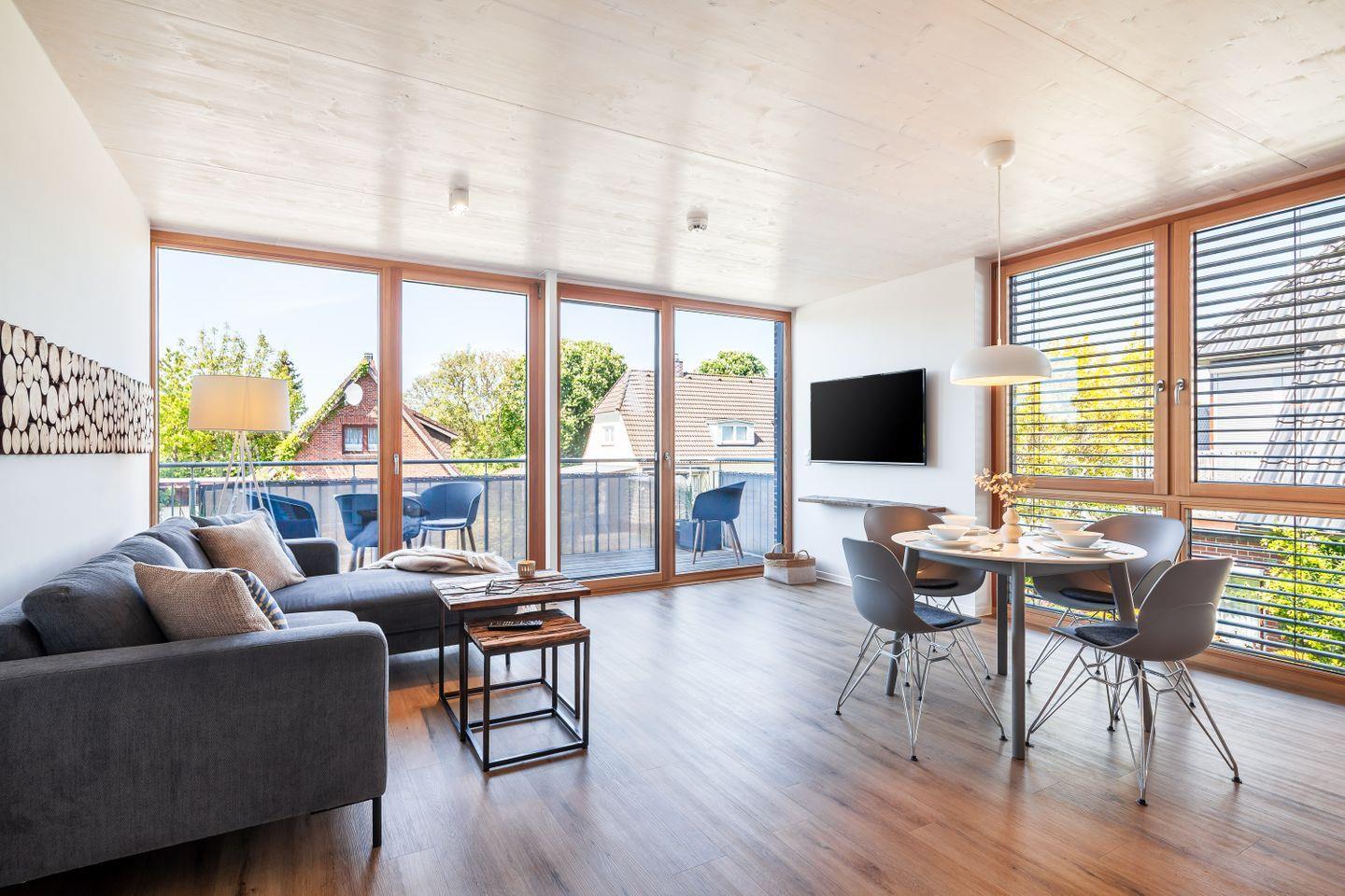 Der helle Wohnbereich öffnet sich zum Balkon; hier beginnt der Tag mit Nordseeluft und endet beim entspannten Sundowner. Zwei Schlafzimmer mit TV bieten Rückzugsorte, das Duschbad mit ebenerdiger Dusche und Fußbodenheizung sorgt für einen angenehmen Start in den Tag.