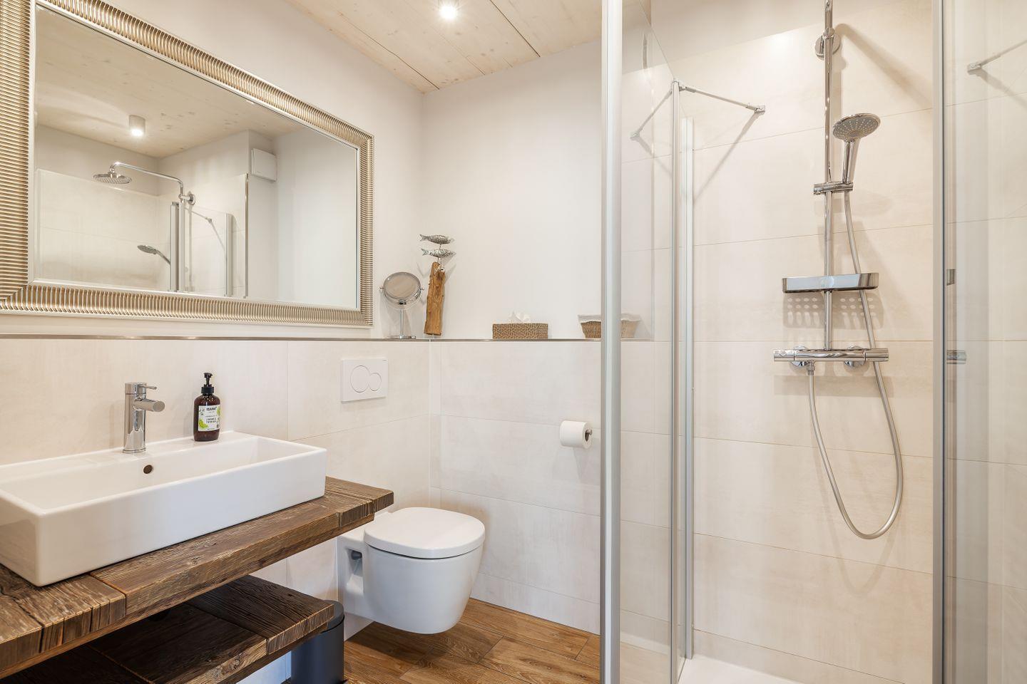 Duschkabine mit ebenerdiger Dusche, Spiegel, WC, Waschbecken, Handtuchtrockner, Föhn, Fußbodenheizung