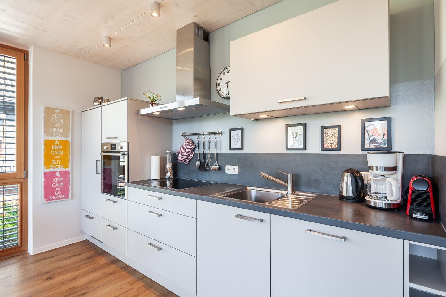 Spüle, Geschirrspüler, Backofen, Herd, Wasserkocher, Toaster, Kaffeemaschine, Kühlschrank, Gefrierfach, Mikrowelle, Espressomaschine