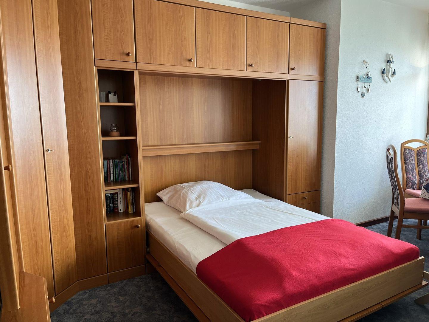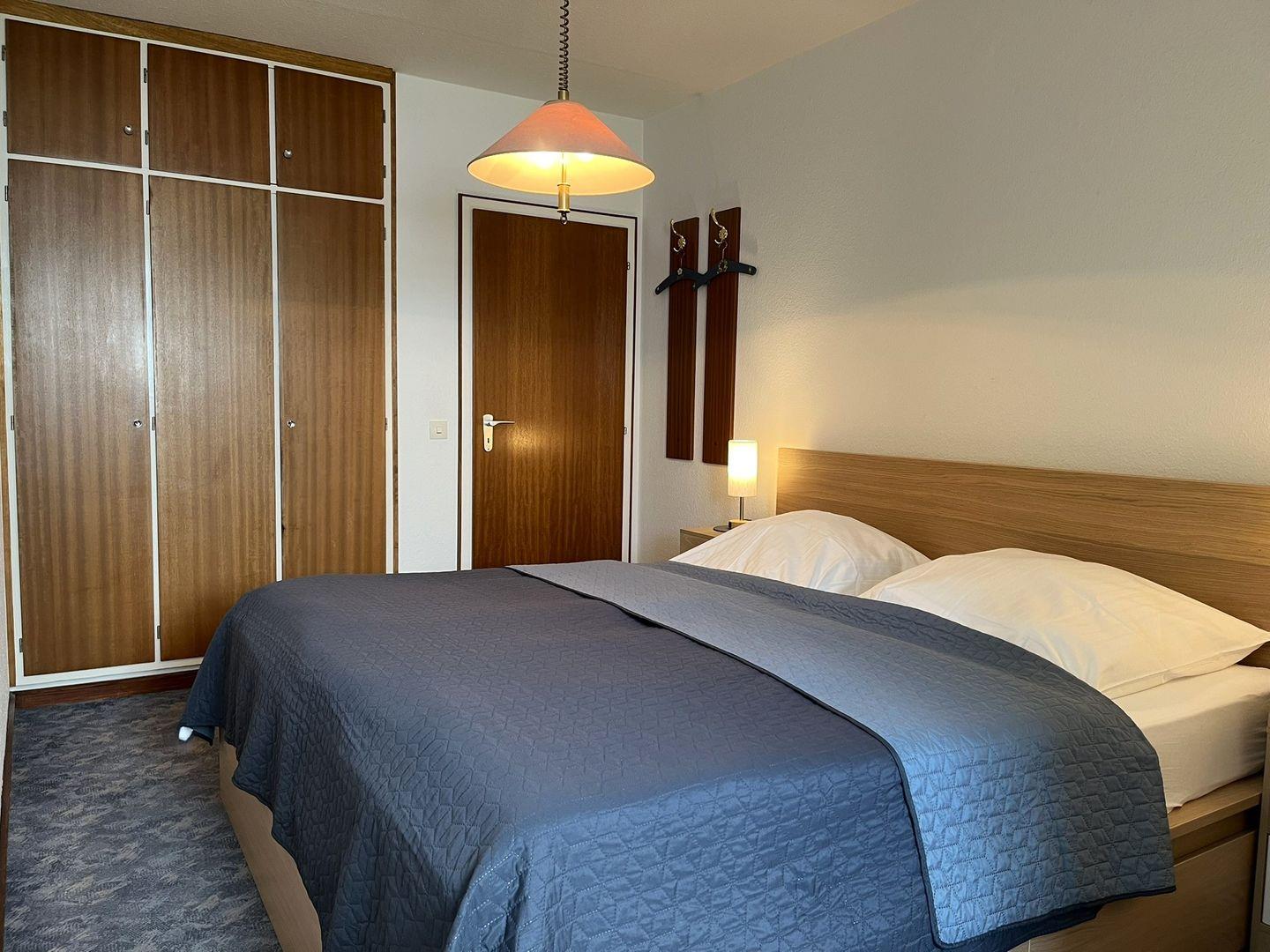 Das Schlafzimmer ist mit einem Doppelbett (2 Einzelmatratzen) und einem Kleiderschrank möbliert und bietet auch genügend Platz um dort ein Babybett aufzustellen, dass man dazu buchen oder selber mitbringen kann.