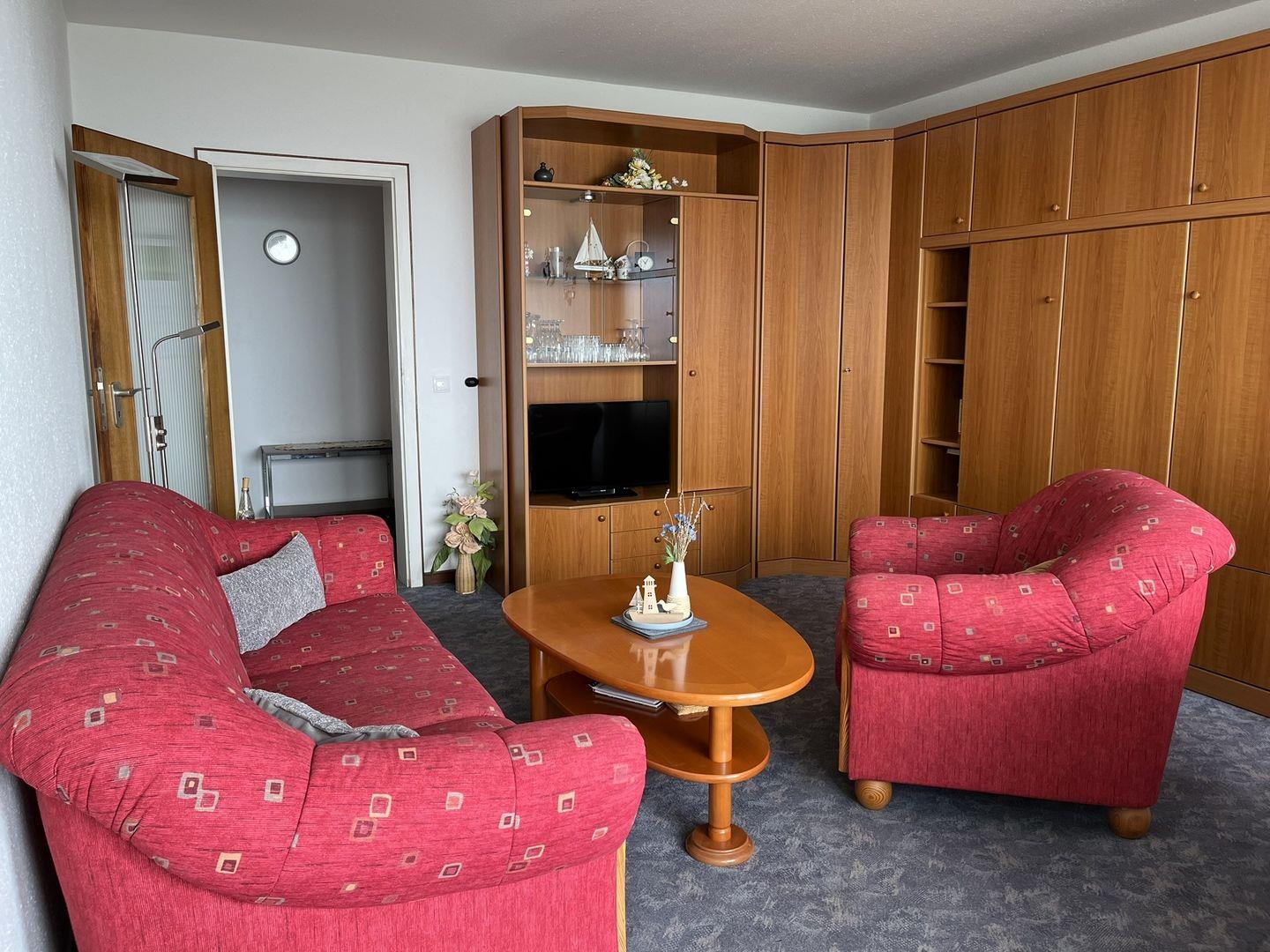 In dem gemütlichen Wohnraum befindet sich neben dem Sofa und einem Sessel auch der Esstisch mit Meerblick. Ein Schrankbett (1,40x 2,m) bietet einem weiteren Gast eine Schlafmöglichkeit