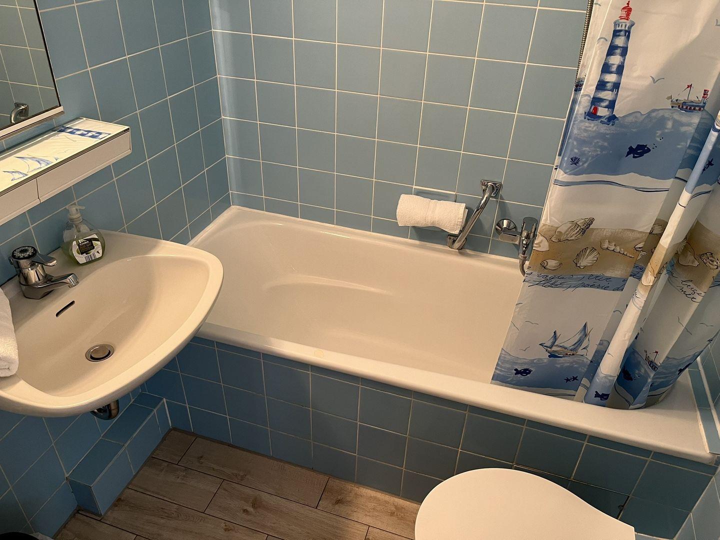 Das kleine Badezimmer bietet eine Badewanne, die auch als Duschmöglichkeit genutzt werden kann.