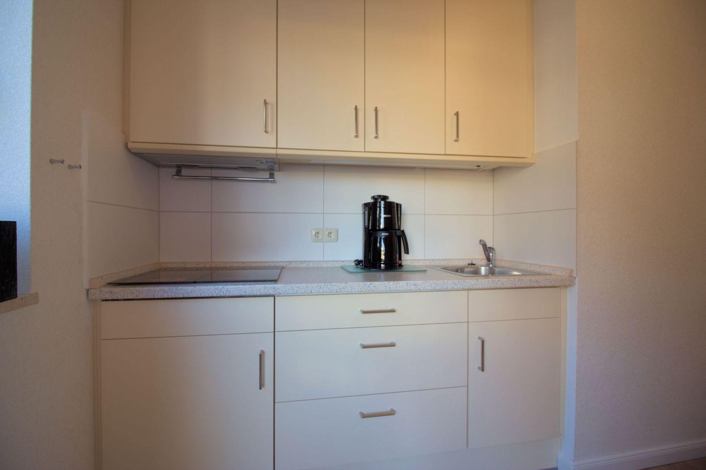 Küchenzeile: Kochfeld, Kühlschrank, Heißwasserkocher, Kaffeemaschine, Toaster.