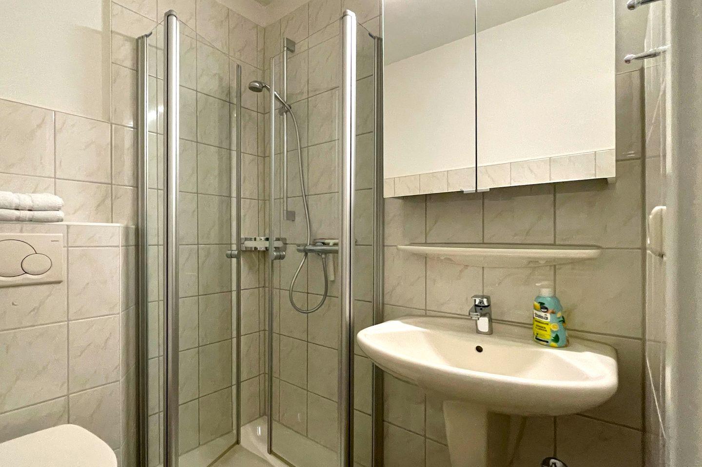 Das Bad verfügt über eine Dusche/WC. Vom Wohnbereich gelangen Sie auf den Süd-West Balkon. Das Schlafzimmer verfügt über ein Doppelbett.