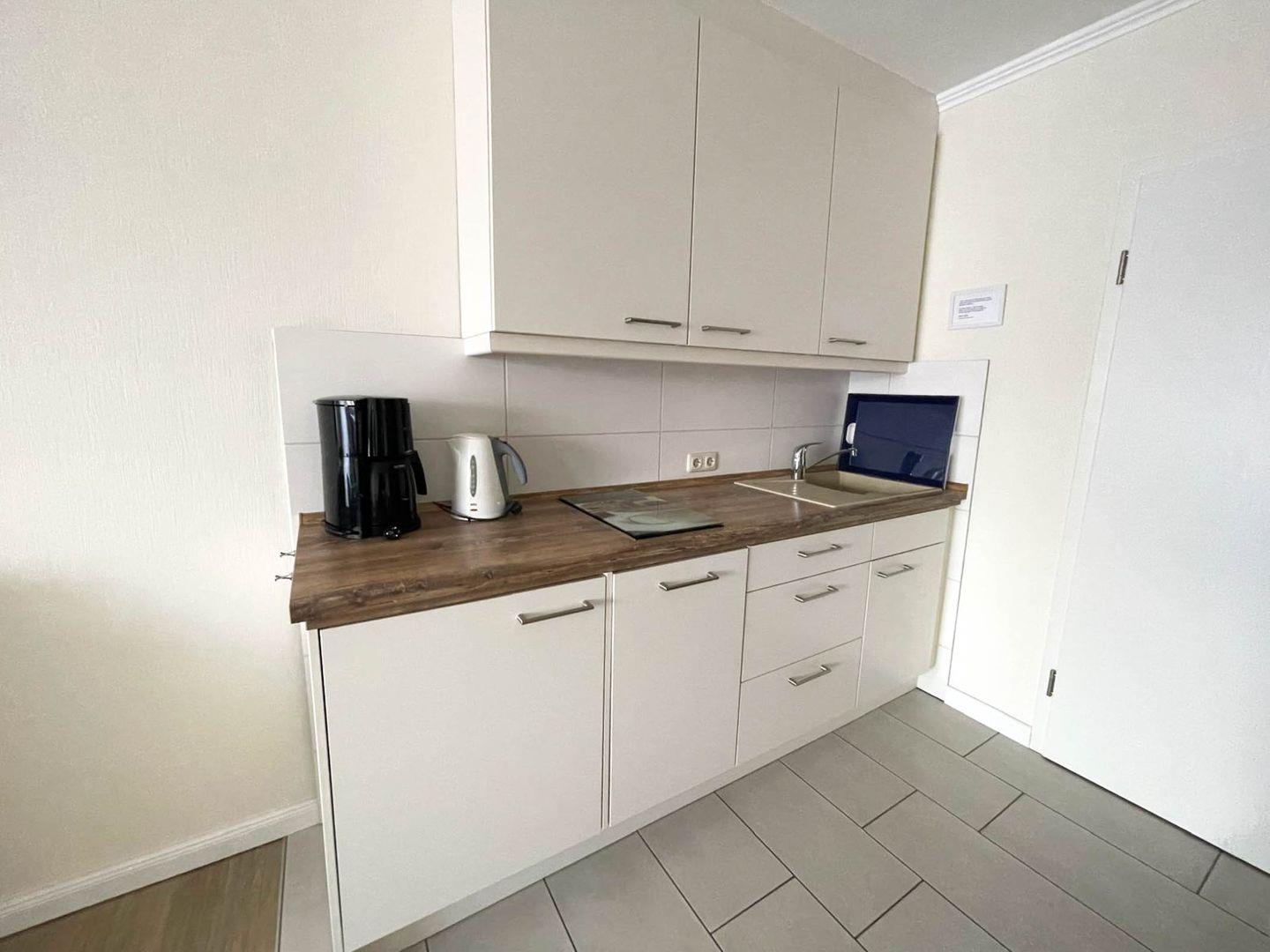 Küchenzeile: Geschirrspüler, Kochfeld, Kühlschrank, Heißwasserkocher, Kaffeemaschine, Toaster.