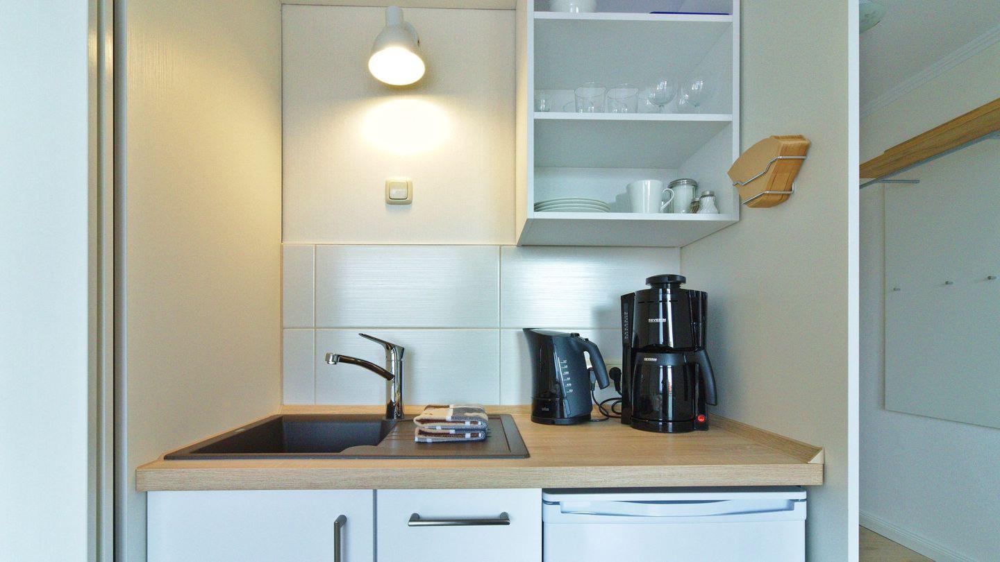 Die Küche ist vollständig im Schiebetürenschrank integriert und enthält Geschirr, Besteck, Kaffeemaschine und Wasserkocher. Perfekt für das Frühstück oder die Brotzeit zwischendurch. Eine Kochplatte und Töpfe sind NICHT vorhanden.