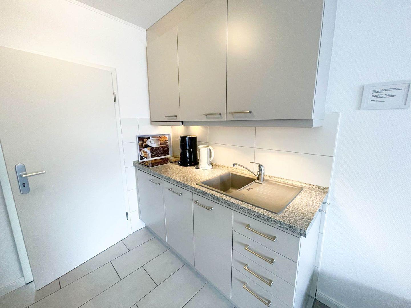Küchenzeile: Geschirrspüler, Kochfeld, Kühlschrank, Heißwasserkocher, Kaffeemaschine, Toaster.