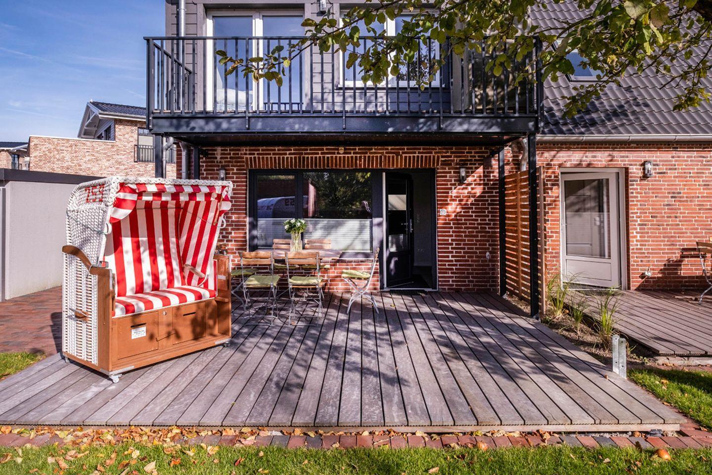 Gemütliche Ferienwohnung in Büsum mit Terrasse, Strandkorb und moderner Küche für erholsamen Familienurlaub nahe dem Meer.