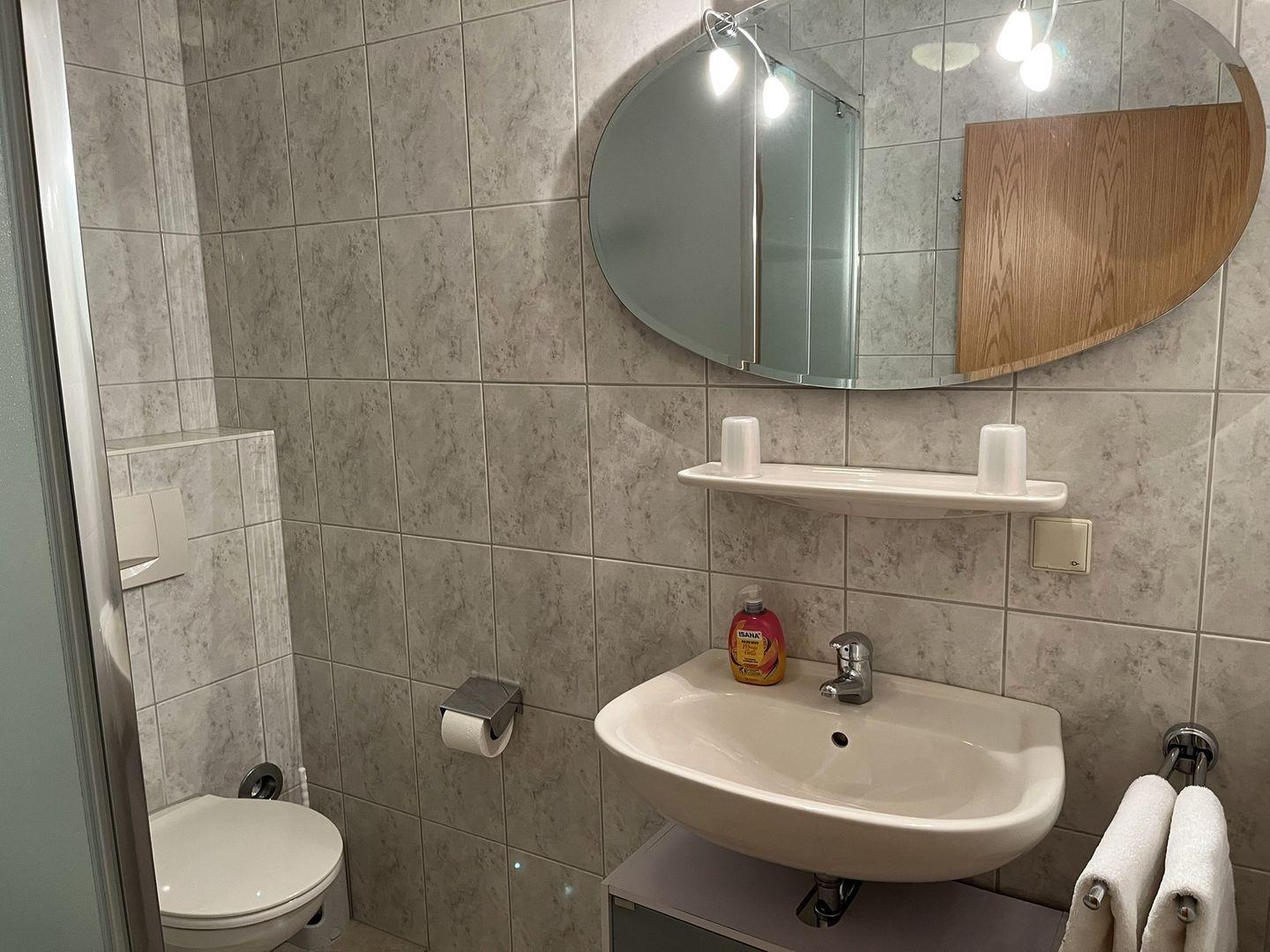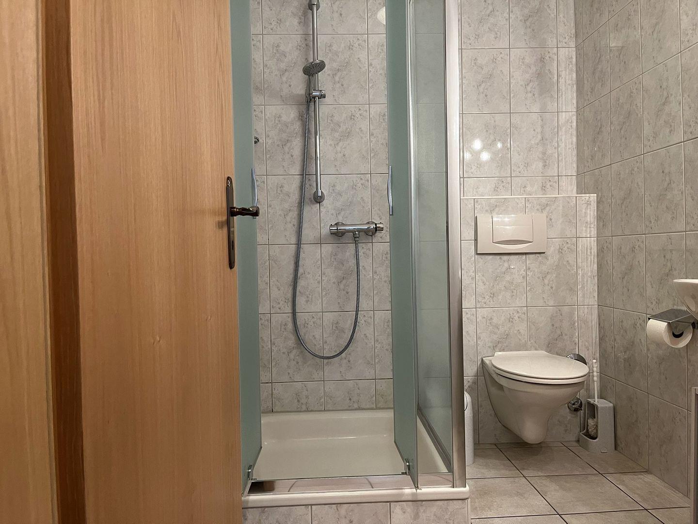 Ein modernes Badezimmer mit Dusche und Handtuchwärmer komplettiert diese schöne Wohnung.