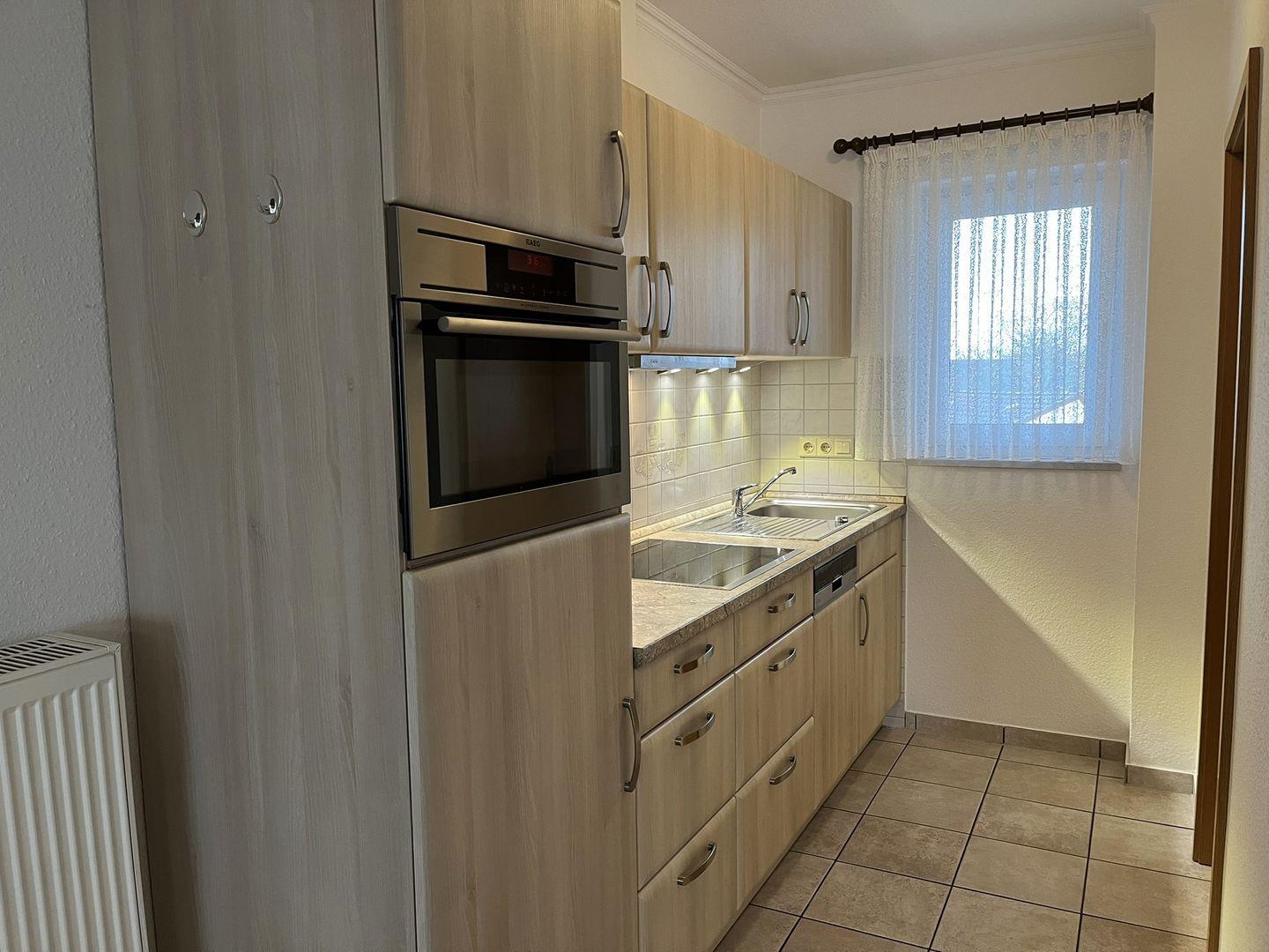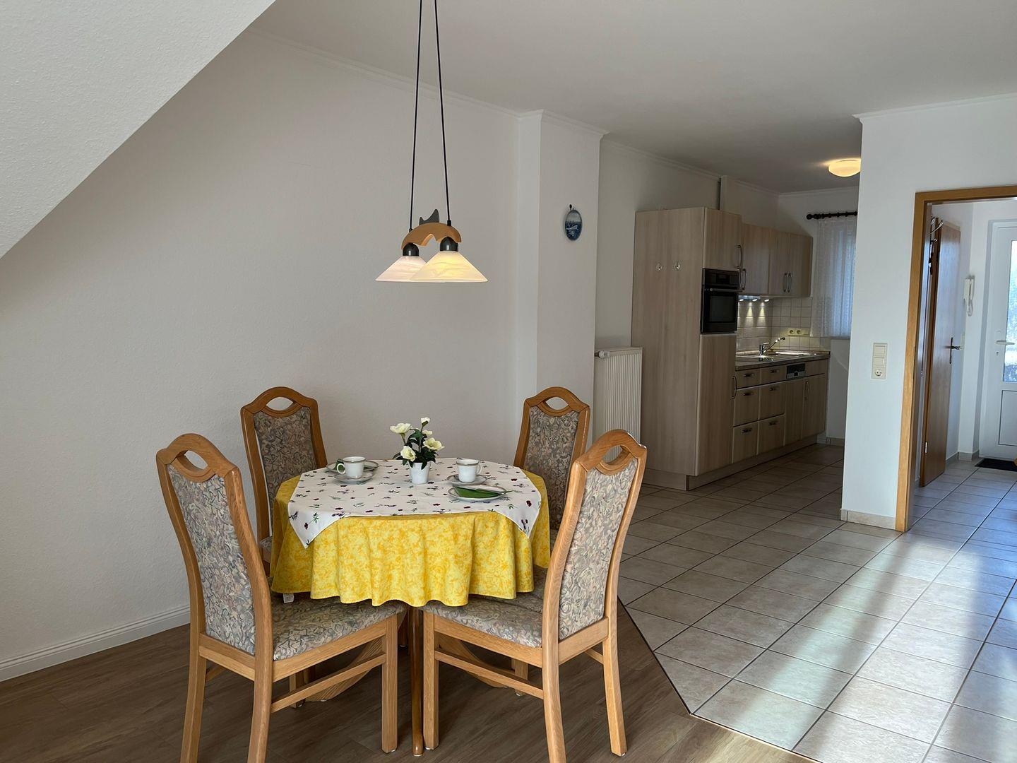 In diesem Raum befinden sich auch der Esstisch und die gut ausgestattete Küchenzeile. Cerankochfeld, Backofen Geschirrspülmaschine sind, neben vielen anderen Sachen, selbstverständlich vorhanden.