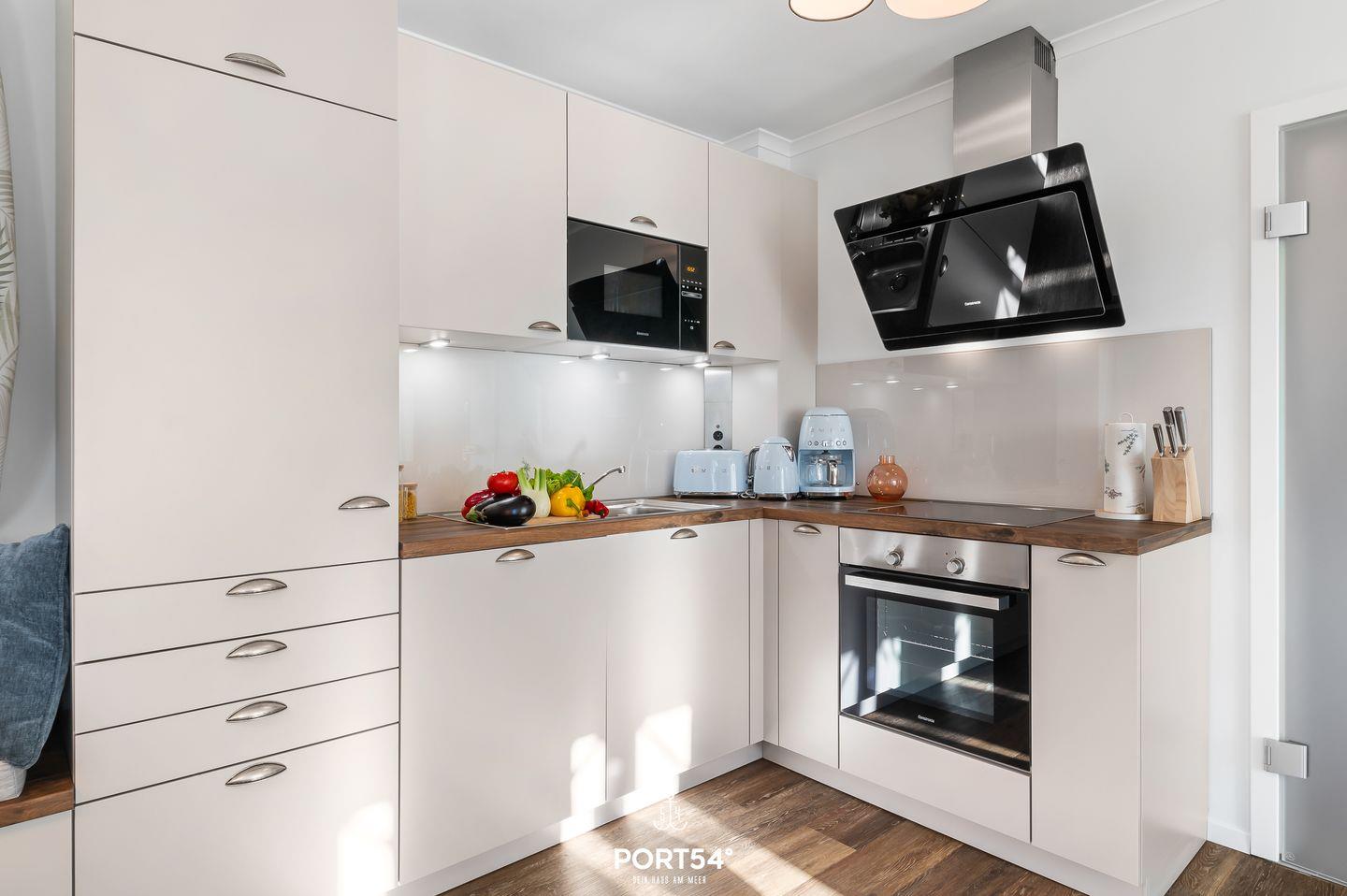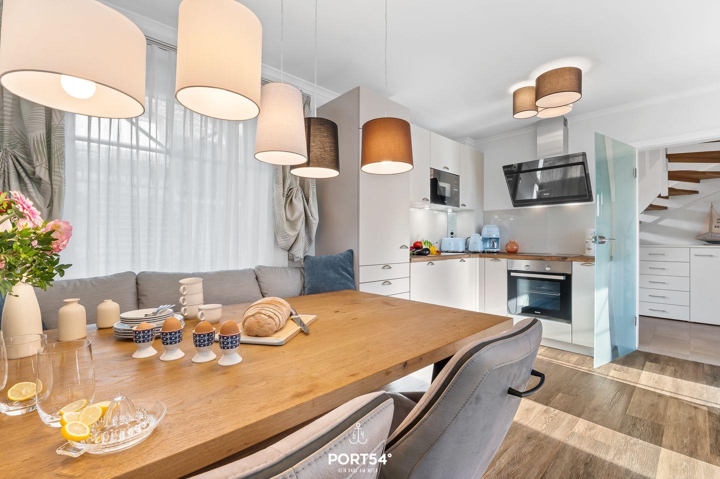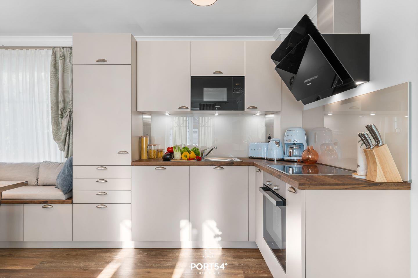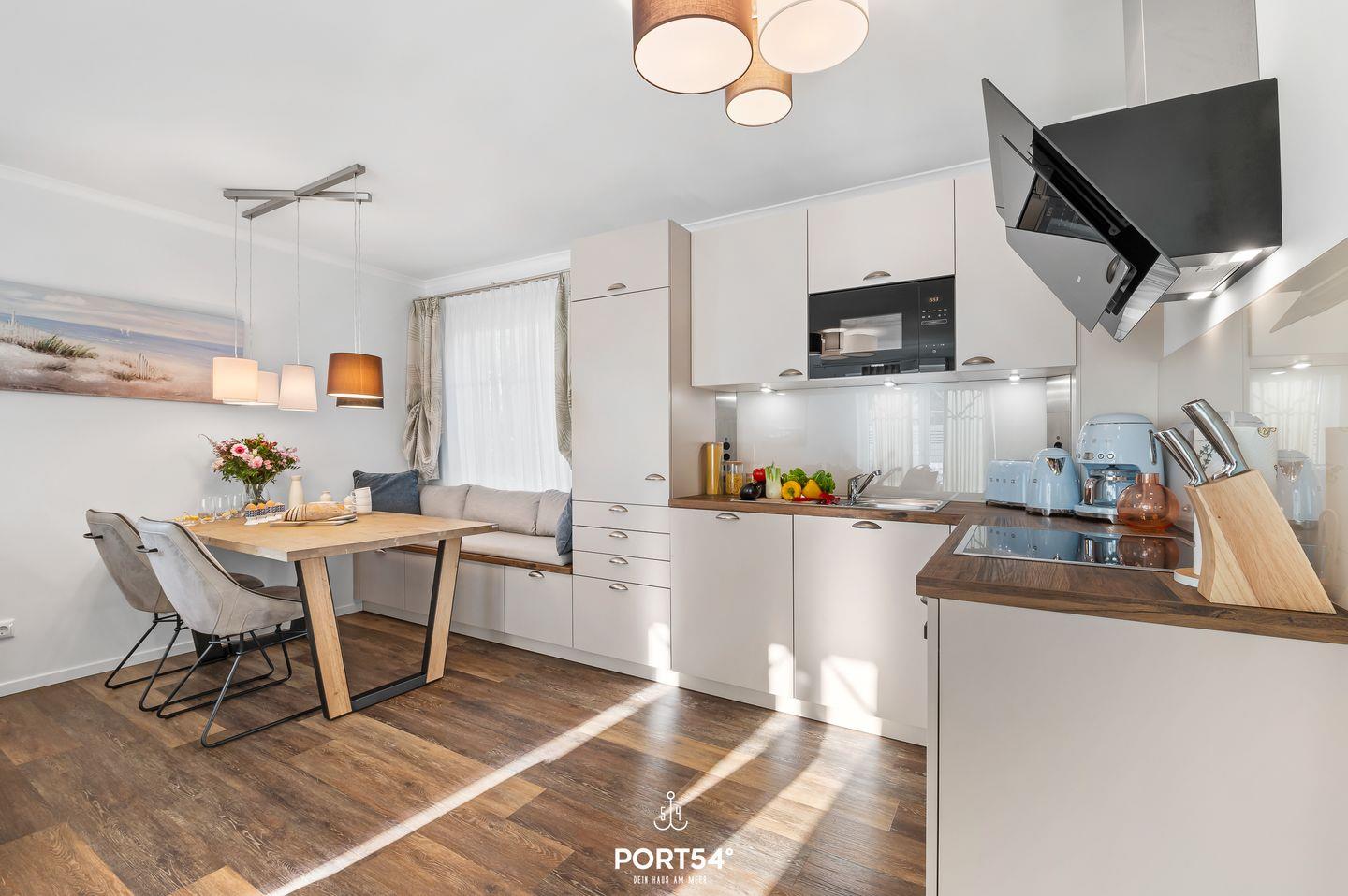 Die Ferienwohnung verfügt über zwei liebevoll eingerichtete Schlafzimmer mit Fliegenschutz an den Fenstern, eines mit einem komfortablen Doppelbett und das andere mit zwei Einzelbetten. Das helle, moderne Wohnzimmer mit bequemer Couch, Flachbild-TV und kostenlosem WLAN lädt zum Entspannen und Verweilen ein. Die offene, voll ausgestattete Küche mit Herd, Backofen, Kühlschrank, Geschirrspüler, Kaffeemaschine und Mikrowelle bietet alles, was Sie für die Zubereitung Ihrer Lieblingsgerichte benötigen. Direkt daneben befindet sich eine gemütliche Essecke, an der Sie gemeinsam speisen können.