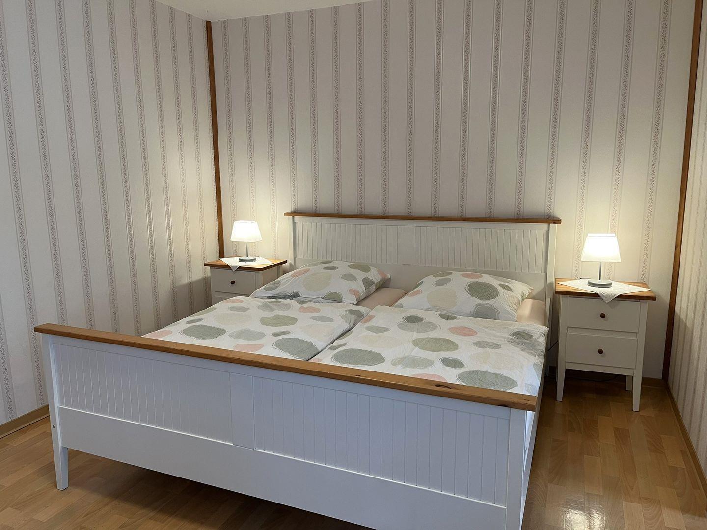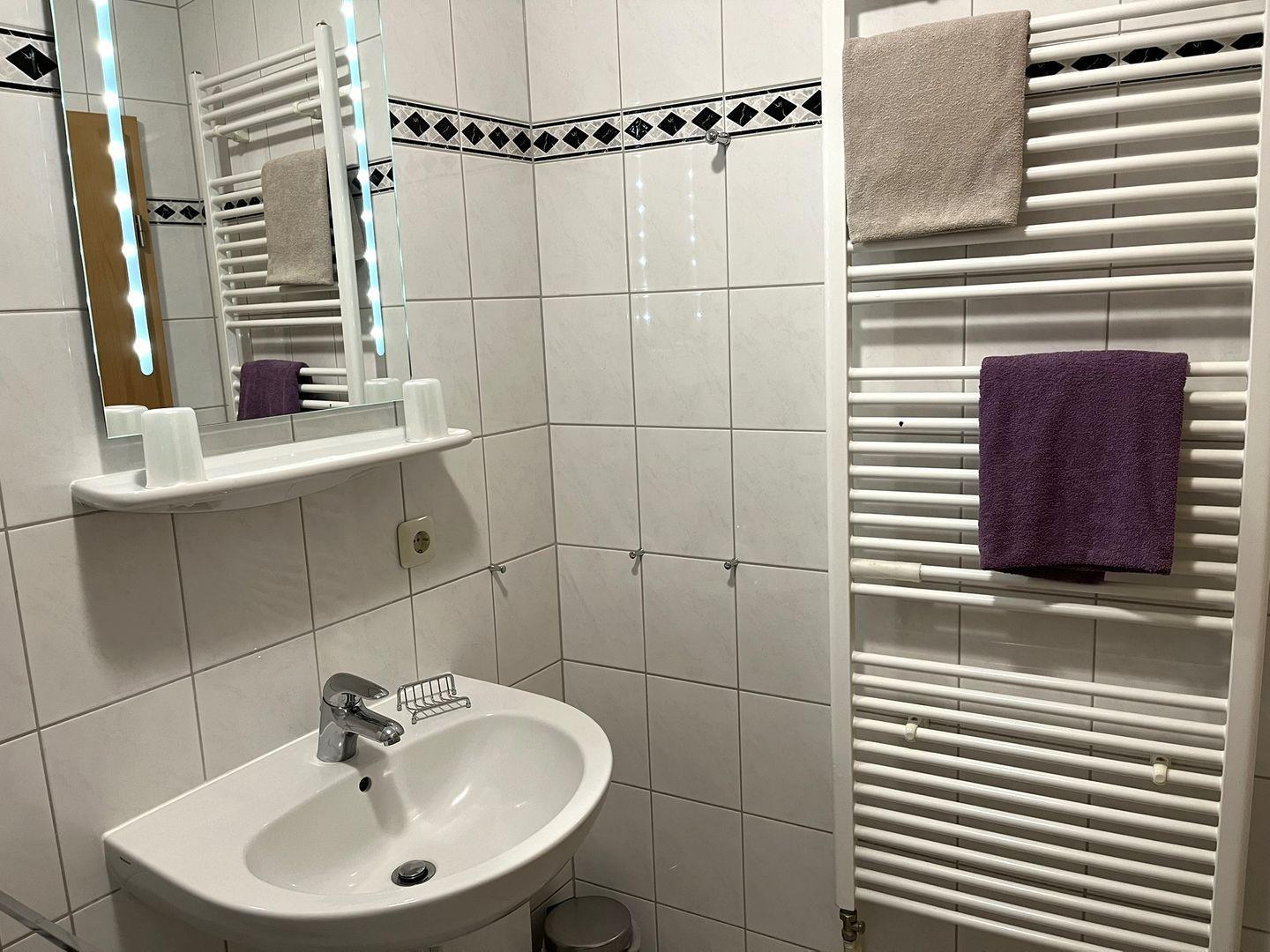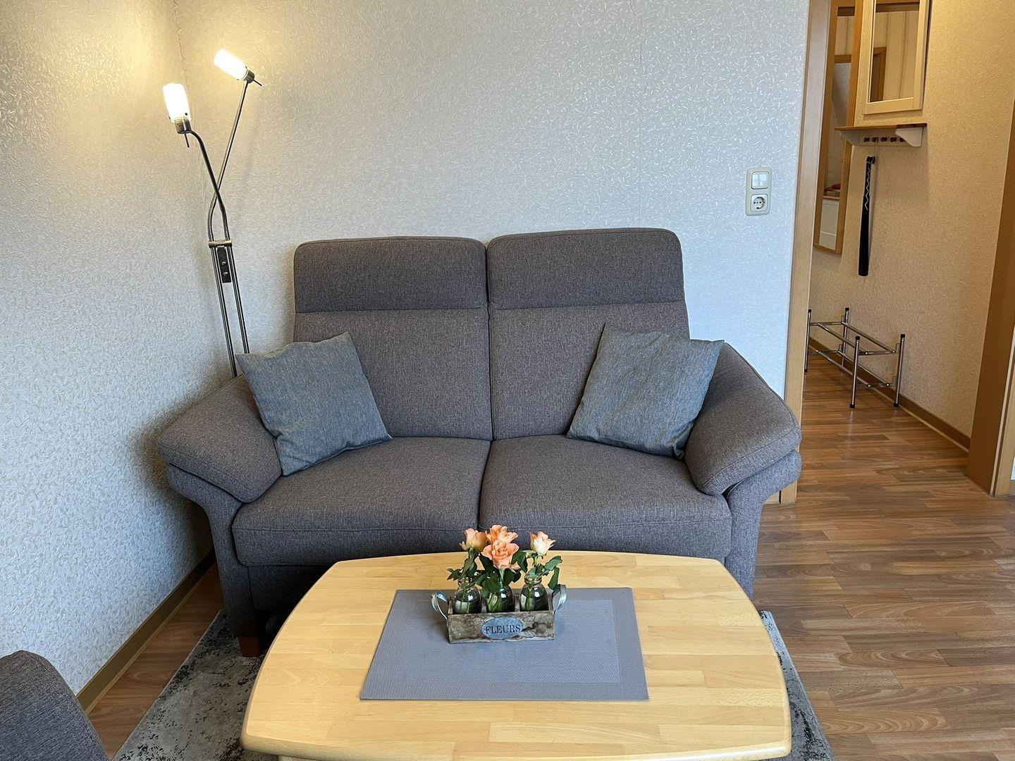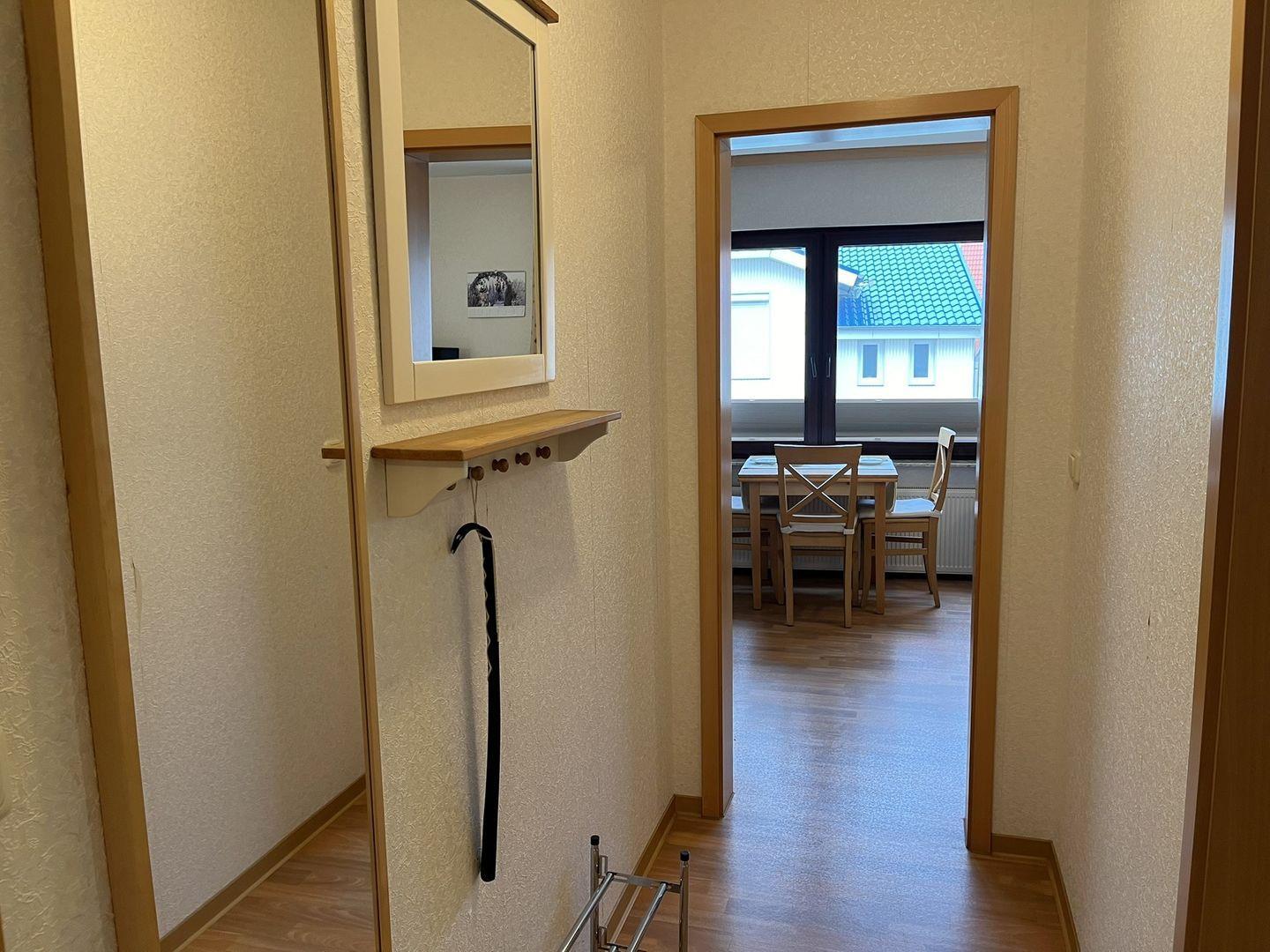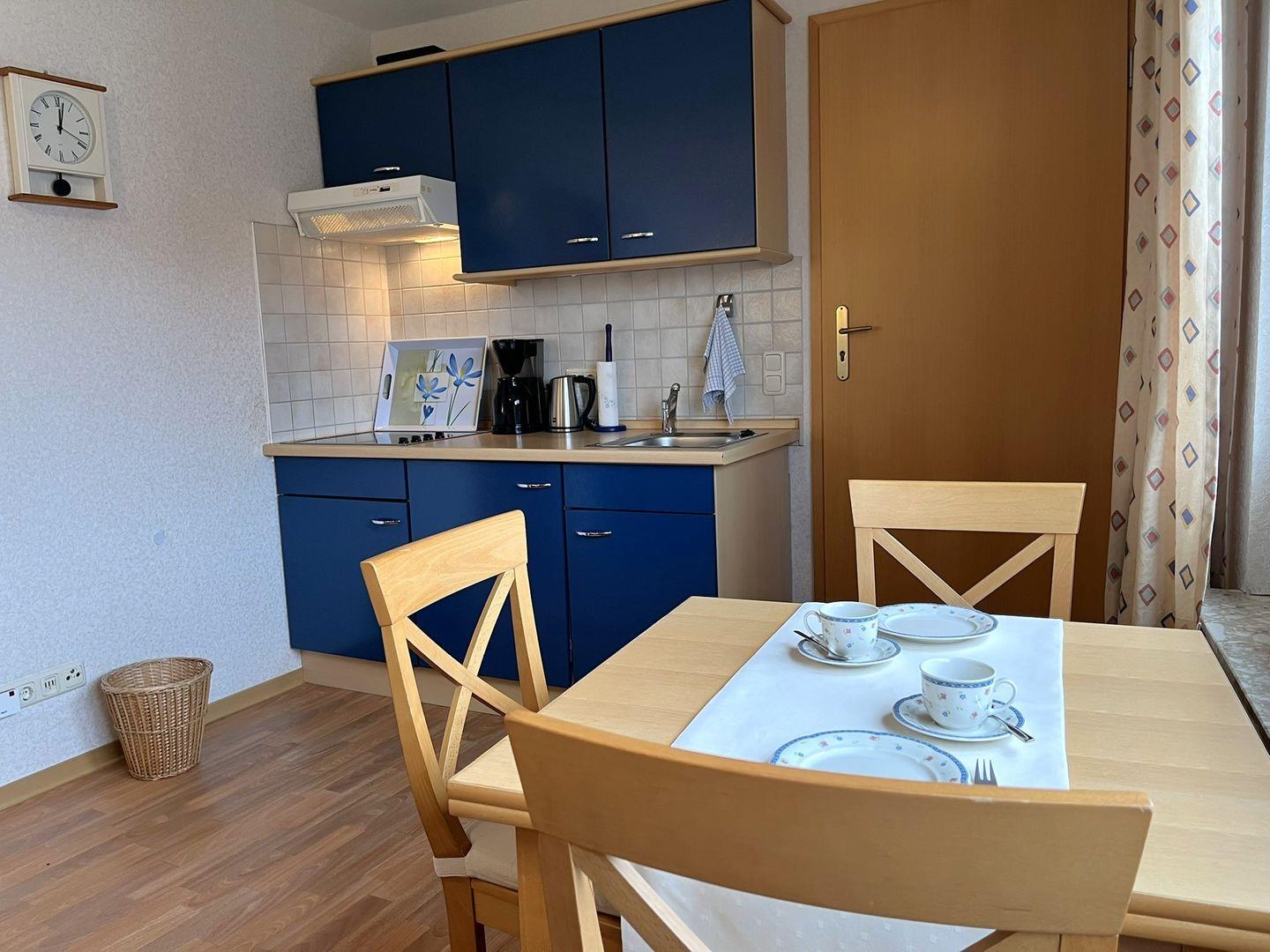 Die helle freundliche Ferienwohnung ist über eine etwas steilere Treppe, eines normalen Wohnhauses, zu erreichen zu erreichen. Das Wohnzimmer, das mit Laminatboden ausgestattet ist, bietet eine Sofaecke sowie einen Sessel zum entspannen. Ein TV ist ebenfalls vorhanden, sodass gemütlichen Abenden nichts im Wege steht. Der Essbereich mit Tisch und Stühlen lädt zu gemeinsamen Mahlzeiten ein, die Sie in der offenen Küche zubereiten können. Die Küchenzeile ist mit Herd, Kühlschrank mit Gefrierfach, Kaffeemaschine, Toaster und Wasserkocher ausgestattet. Küchenutensilien sowie Geschirr und Besteck stehen ebenfalls bereit.