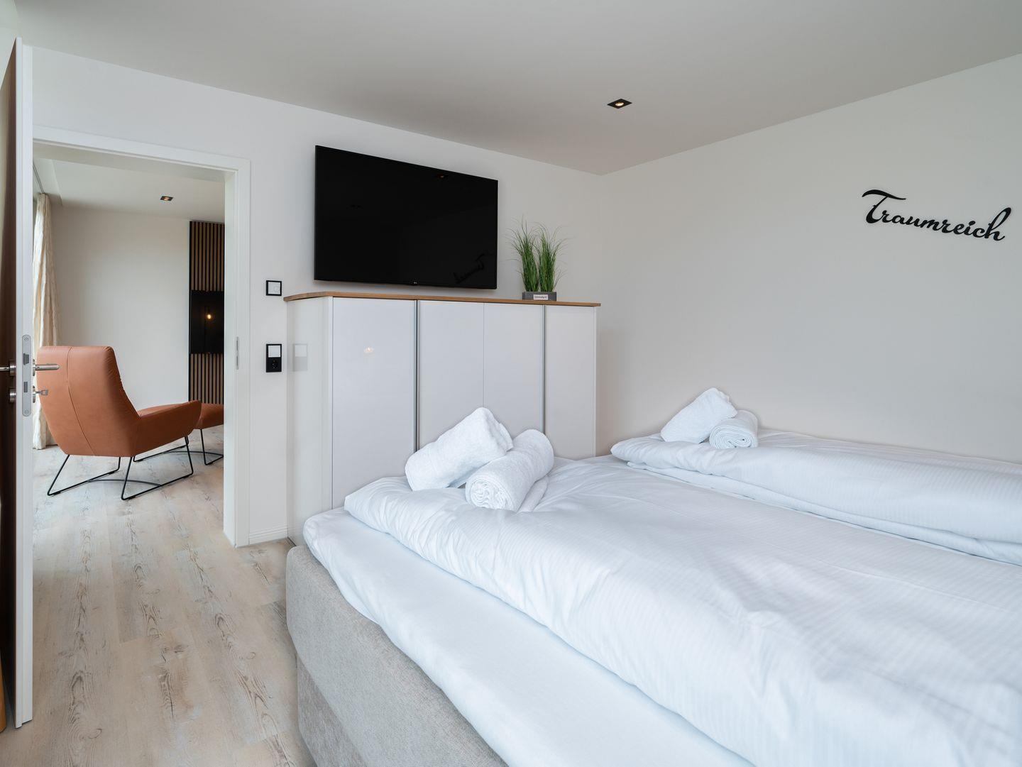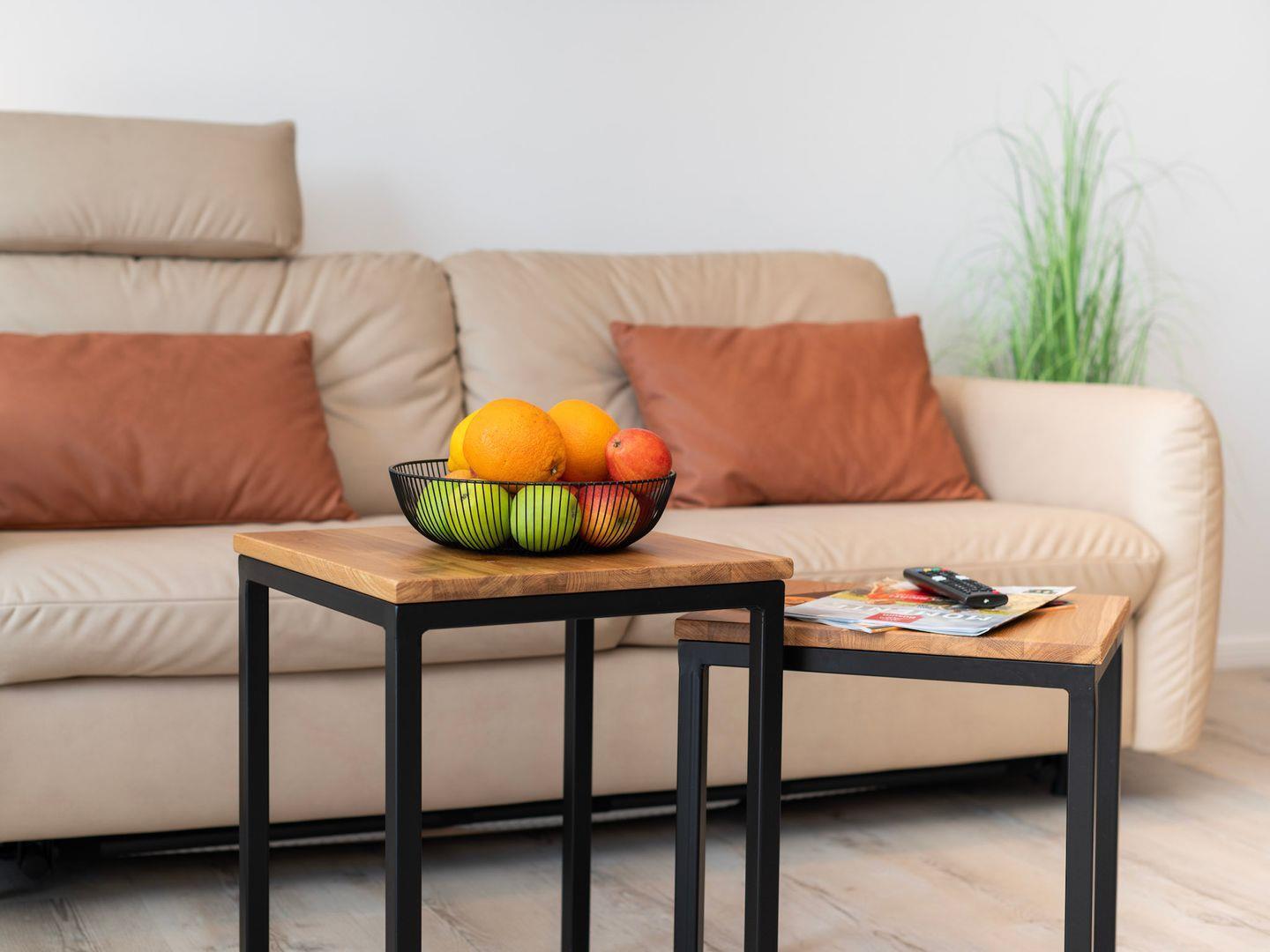 Der Wohnraum ist lichtdurchflutet und mit einer bequemen Sofaecke ausgestattet, wo Sie nach einem erlebnisreichen Tag entspannen und die Zeit genießen können. Genießen Sie auch die Annehmlichkeiten durch drei Fernseher und kostenfreies WLAN, um jederzeit in Kontakt zu bleiben oder Ihre Lieblingsfilme zu streamen.