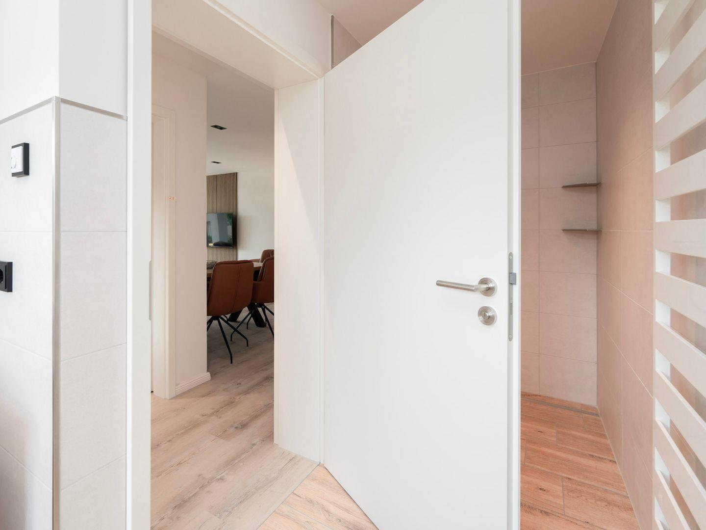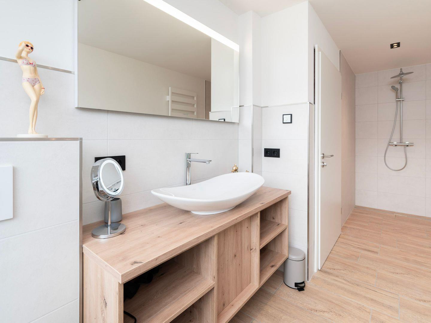 Der hauseigene Aufzug erleichtert den Zugang zur Wohnung, besonders für Familien mit kleinen Kindern oder Gäste mit eingeschränkter Mobilität. Die Fußbodenheizung sorgt für angenehme Wärme und Wohlbefinden, während die moderne Dusche mit bodengleichem Zugang zusätzlichen Komfort bietet. Auch der Haartrockner, Kosmetikspiegel und weitere Badezimmerutensilien lassen keine Wünsche offen.