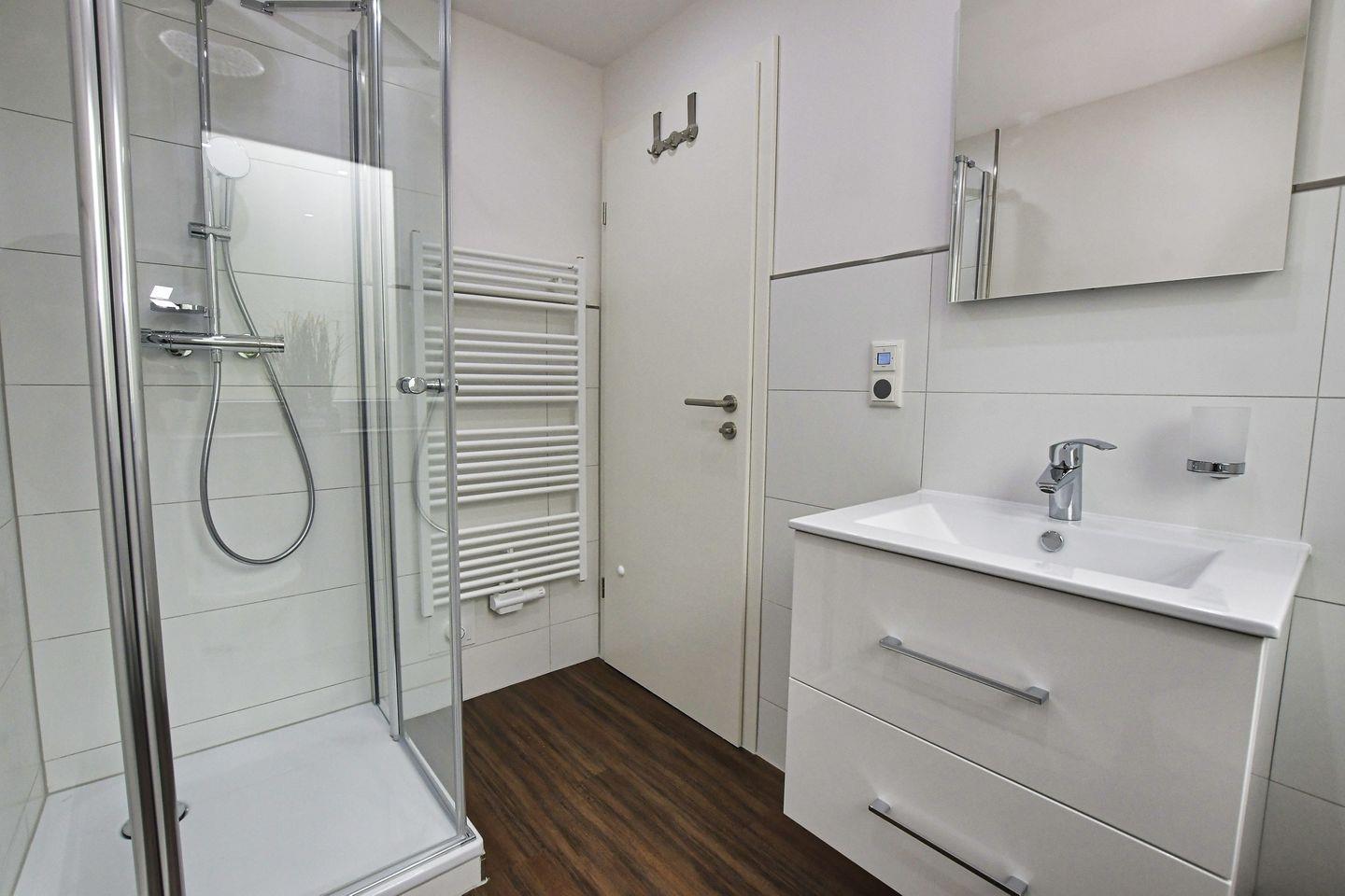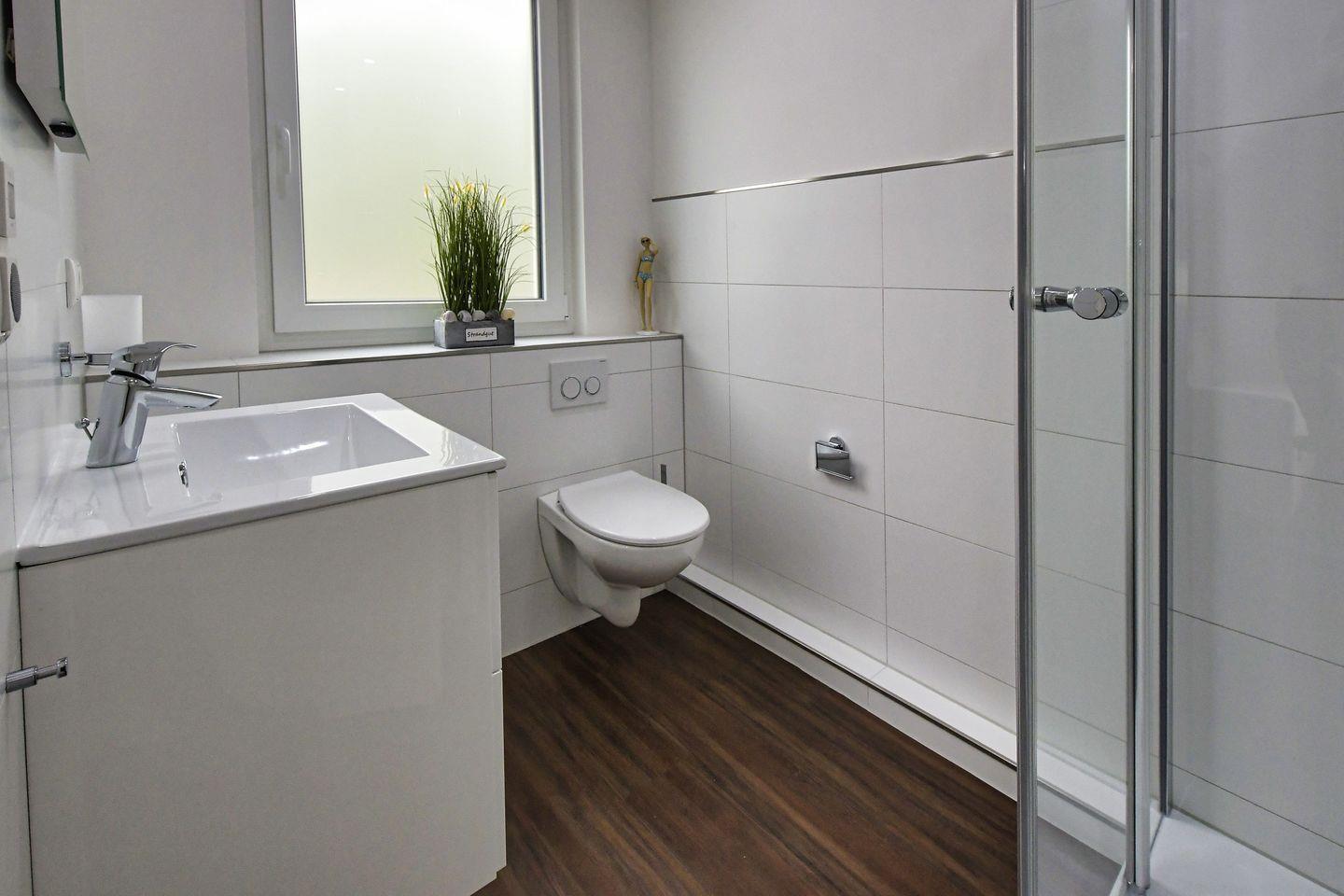 Das Badezimmer ist mit einer bodengleichen Dusche, einem WC und einem Waschbecken ausgestattet und bietet Ihnen die perfekten Annehmlichkeiten für Ihre tägliche Routine. Für zusätzlichen Komfort sorgt die Fußbodenheizung, die für wohlige Wärme sorgt, selbst an kühleren Tagen. Zudem stehen Ihnen Waschmaschine und Trockner zur Verfügung, die gemeinschaftlich genutzt werden können.