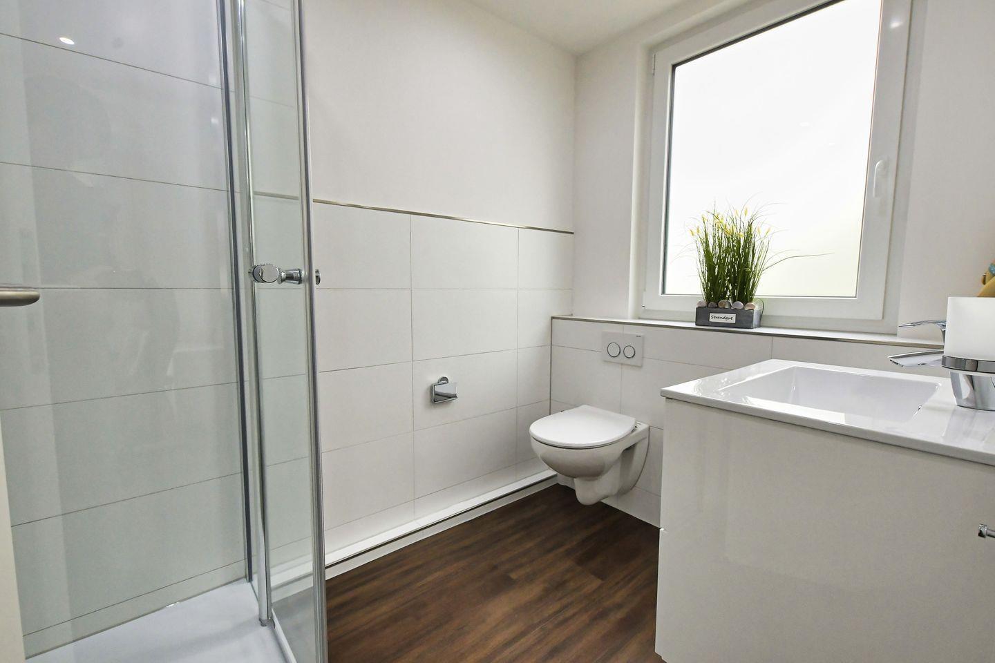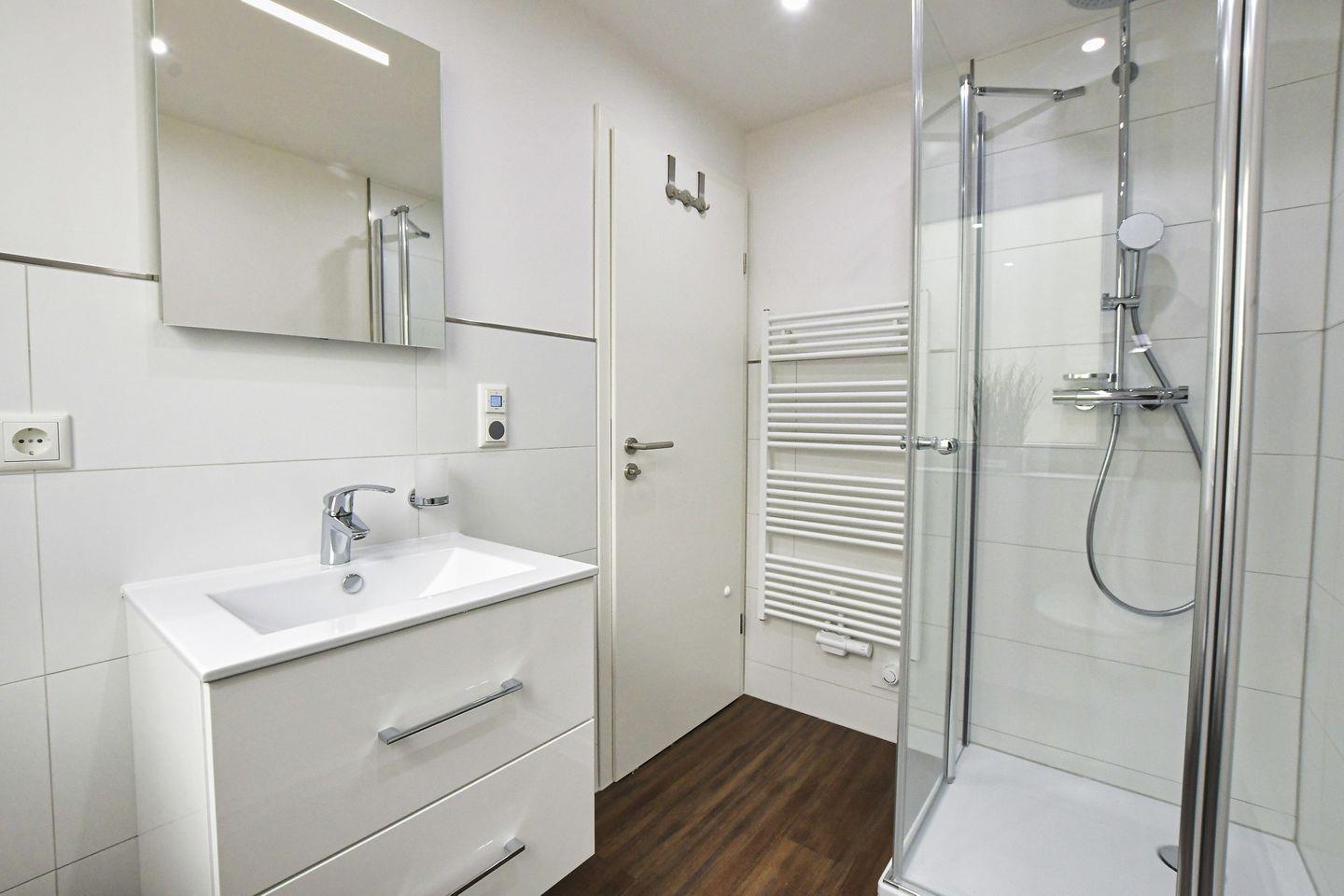 Das Badezimmer ist modern gestaltet und verfügt über eine bodengleiche Dusche, die den Einstieg erleichtert – ideal für Gäste jeden Alters. Hier finden Sie ebenfalls einen Haartrockner und ausreichend Stauraum, um Ihre persönlichen Utensilien unterzubringen.
