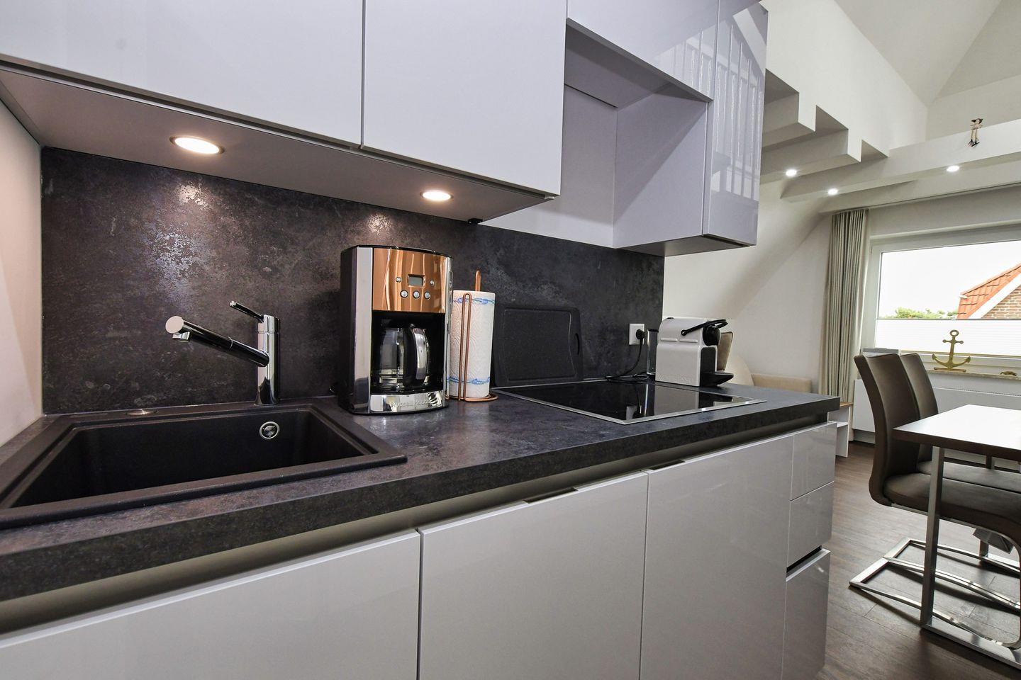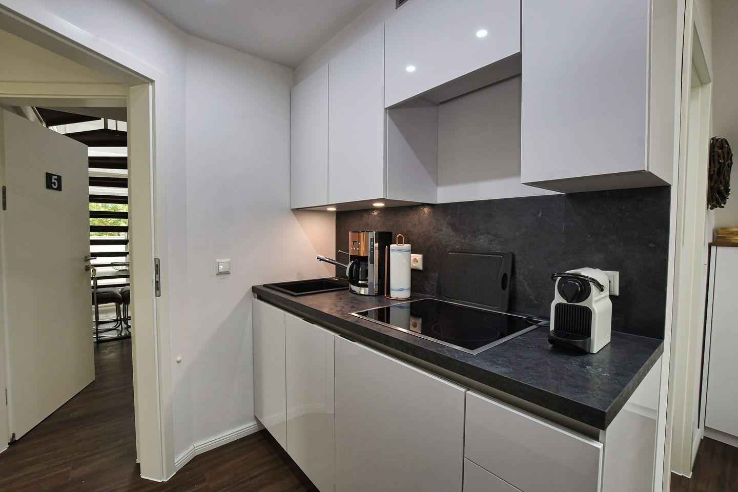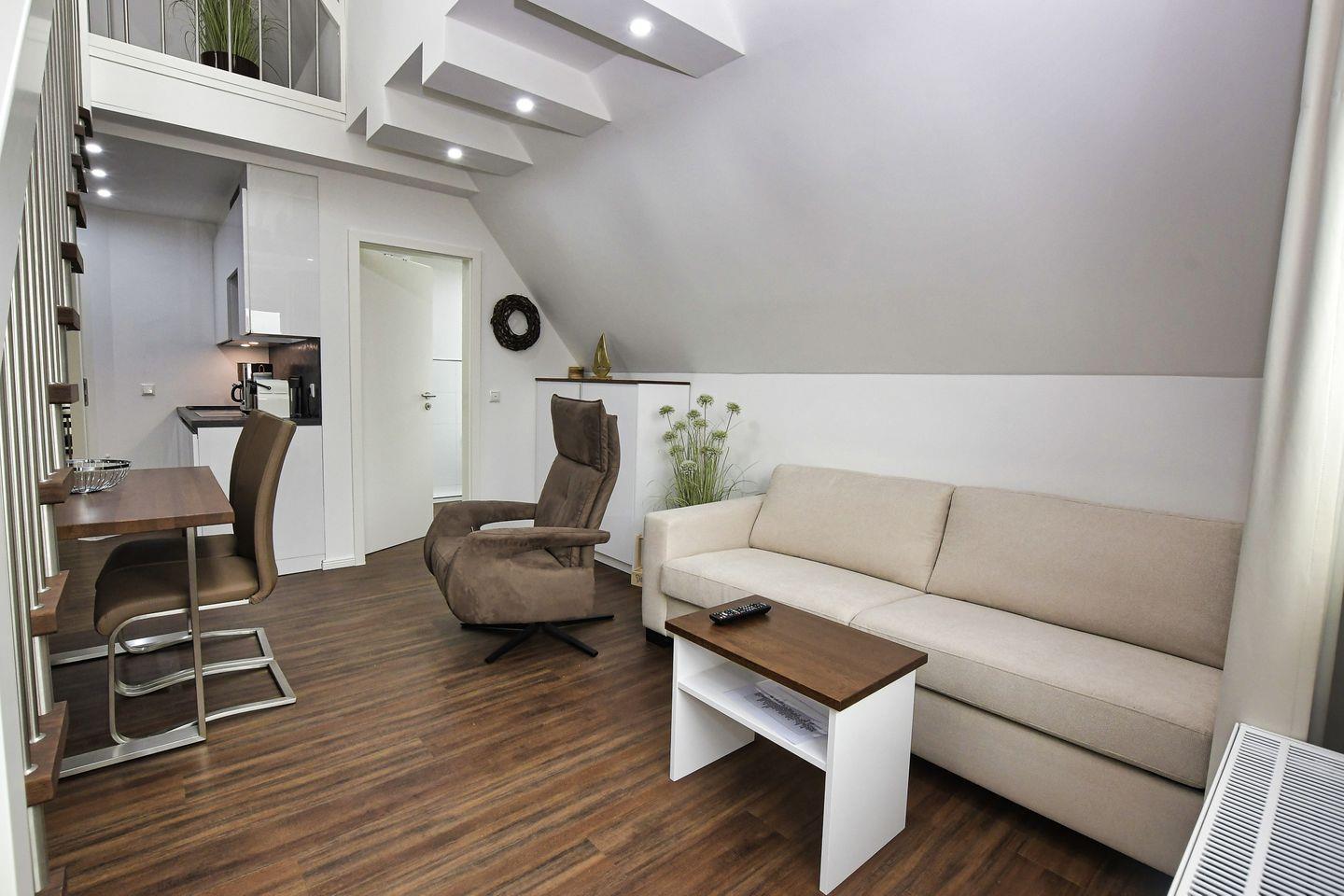 Die Wohnung ist geschmackvoll und funktional eingerichtet. Sie verfügt über ein Schlafzimmer mit einem gemütlichen Bett, einen modernen Wohnbereich mit Sofaecke und Esstisch sowie eine voll ausgestattete offene Küche. Hier können Sie die kulinarischen Köstlichkeiten der Region zubereiten oder sich bei einem frisch gebrühten Kaffee am Morgen entspannen. Zu den Annehmlichkeiten gehören ein Cerankochfeld und eine Kaffeemaschine. Trockner- und Waschmaschinennutzung stehen zur gemeinschaftlich Nutzung zur Verfügung.