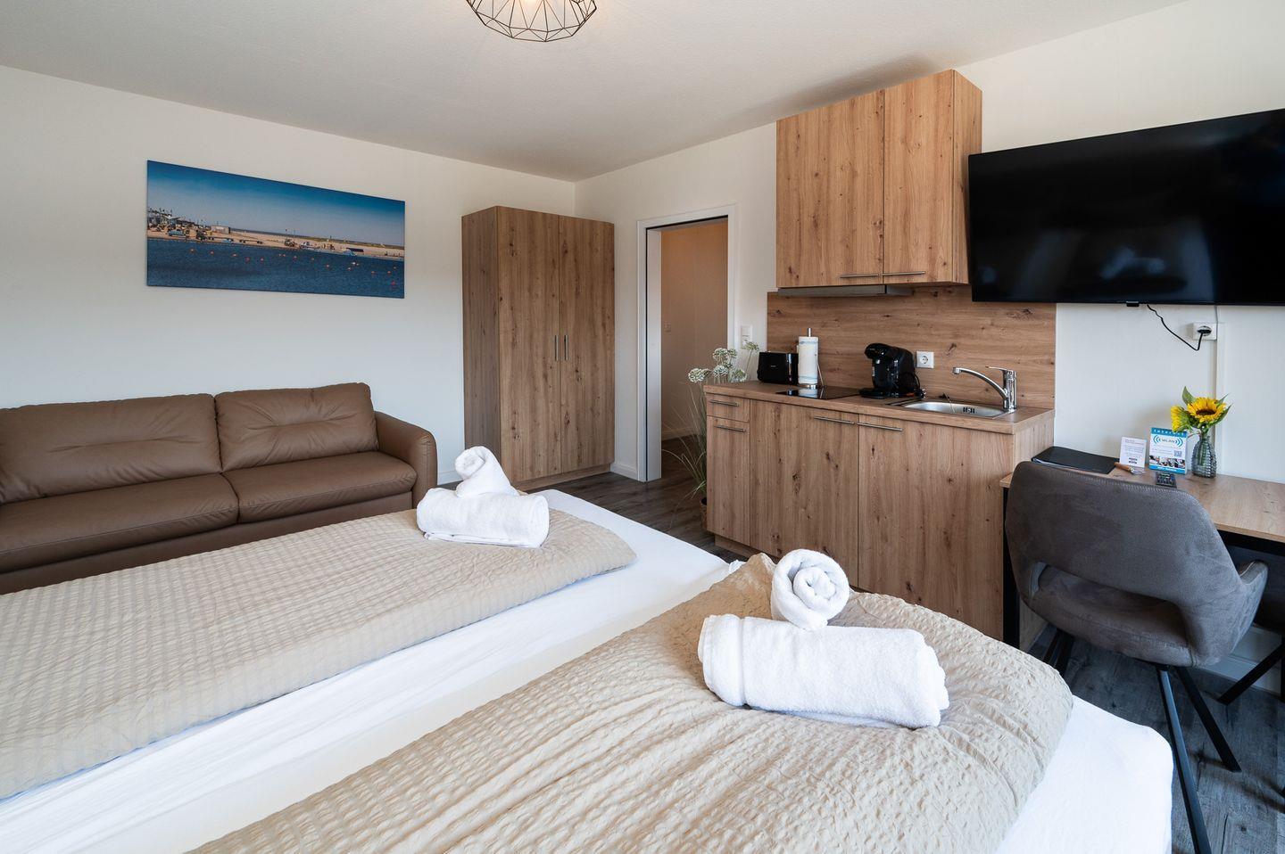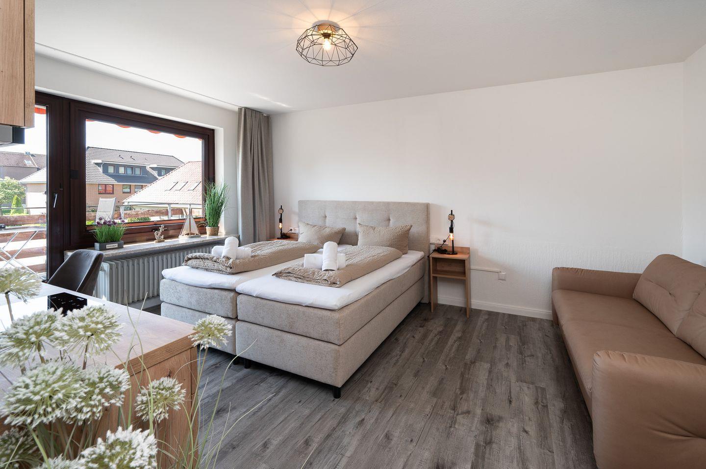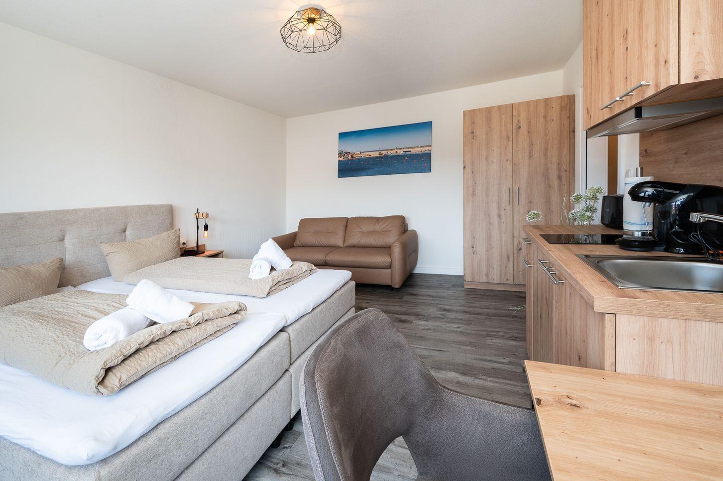 Bitte beachten Sie, dass es sich bei der zusätzlichen Schlafmöglichkeit um ein Schlafsofa handelt, das sich im selben Raum wie das Bett befindet.