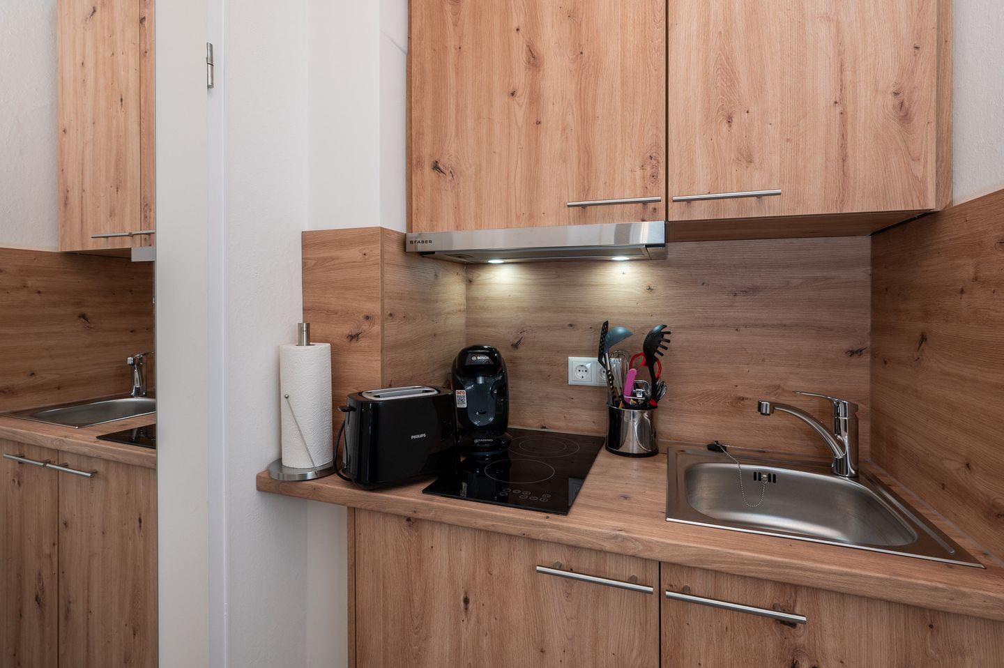 Die Kochnische ist mit allen nötigen Küchengeräten und Utensilien ausgestattet, um Sie bei der Zubereitung Ihrer Lieblingsgerichte zu unterstützen. Sie finden hier unter anderem einen Kühlschrank, einen 2-Platten-Herd, Geschirr und Besteck sowie eine Espressomaschine, für die perfekten Kaffee-Momente am Morgen. Im Essbereich mit Esstisch können Sie gemütlich speisen und gesellige Abende verbringen.