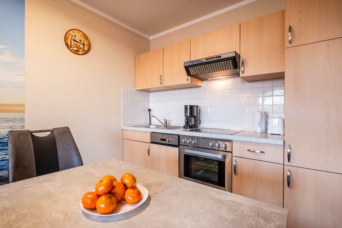 Das Apartment verfügt über ein heimeliges Wohnzimmer, das mit einer gemütlichen Sofa-Ecke, einem Sessel und einem Essbereich ausgestattet ist, wo Sie nach einem erlebnisreichen Tag gemeinsame Mahlzeiten genießen können. Großzügige Fenster sorgen für viel Tageslicht und eine angenehme Atmosphäre. Die offene Küche bietet alle nötigen Annehmlichkeiten, um köstliche Speisen zuzubereiten: Ein Cerankochfeld, Backofen, Kühlschrank, Geschirrspüler und moderne Küchenutensilien stehen Ihnen zur Verfügung.