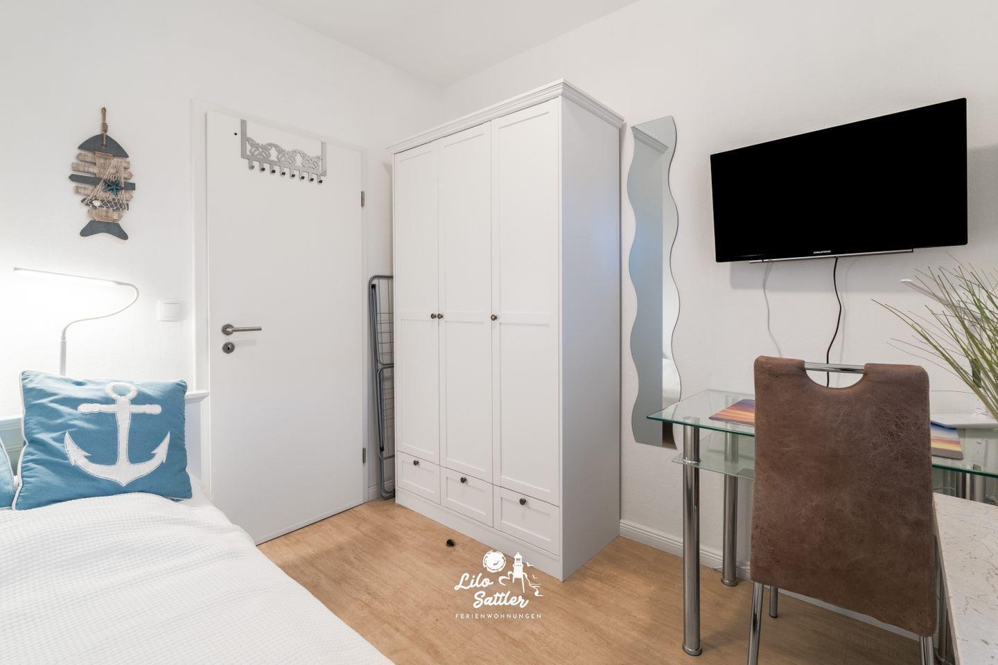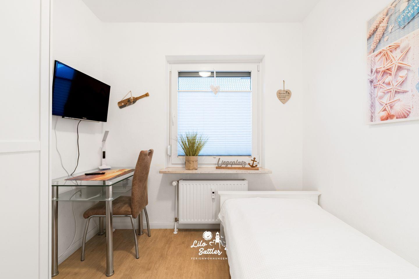 Einzelbett (200 cm x 90 cm), Lattenrost Kopf- und Fußteil verstellbar, Kleiderschrank, Smart TV, Spiegel, kleiner Schreibtisch mit Stuhl, Fenster mit Plissee und Fliegenschutzgitter, Außenrolladen
