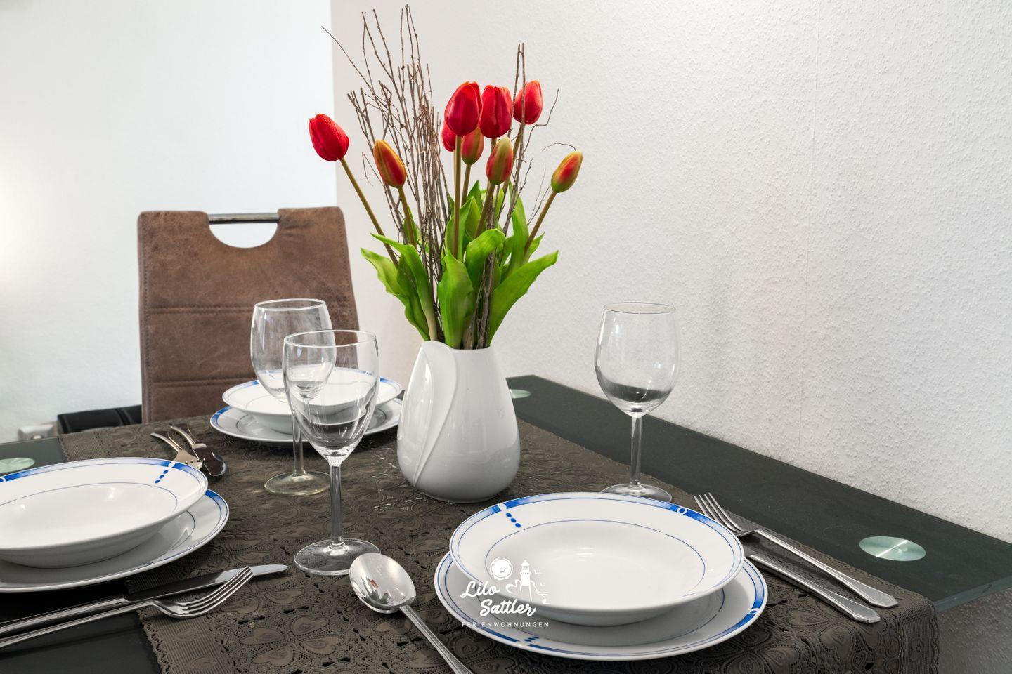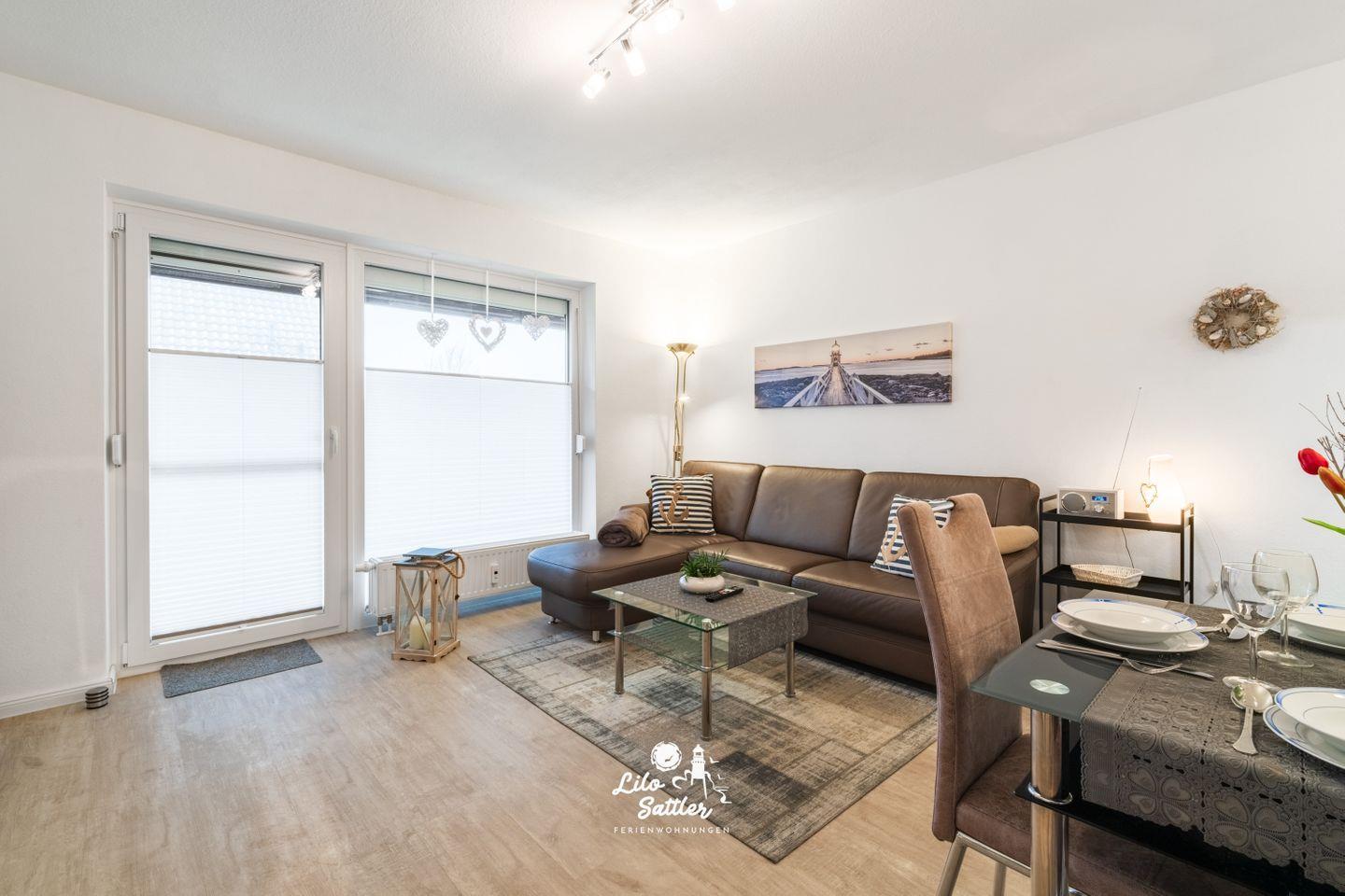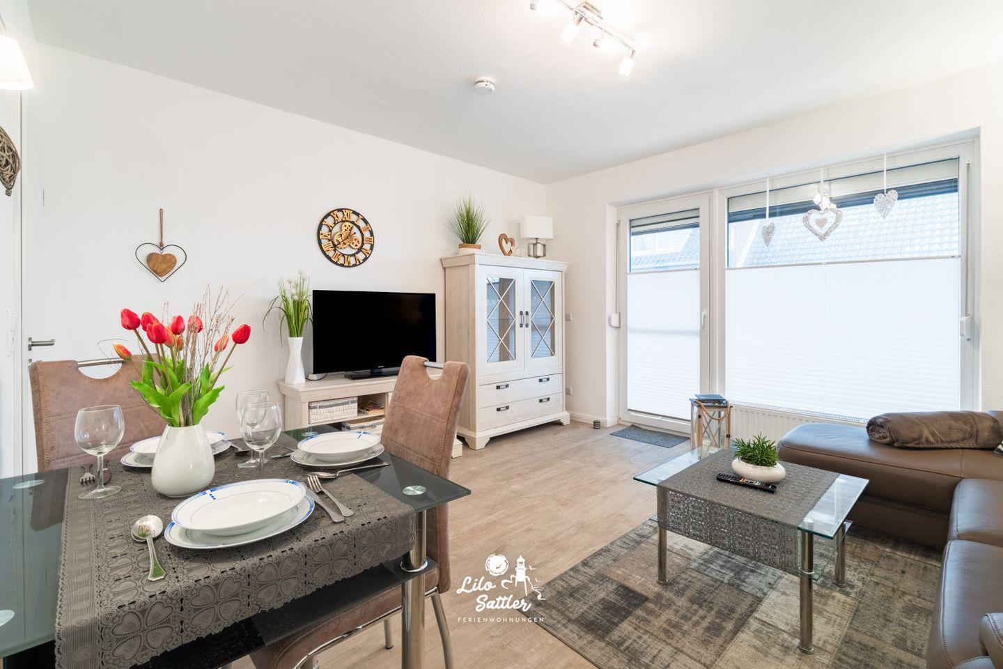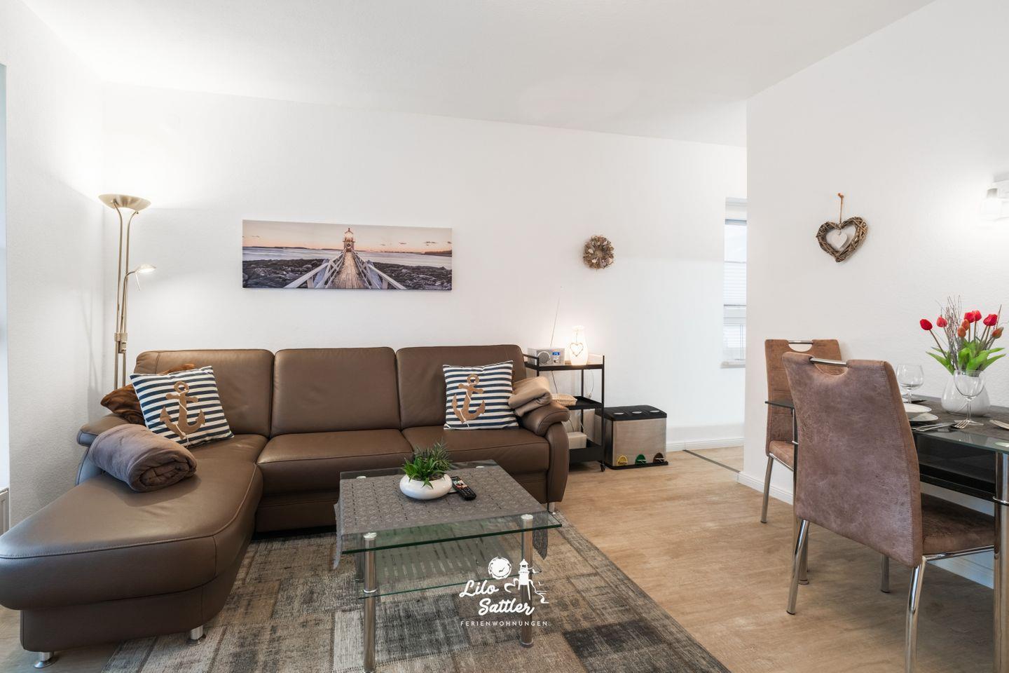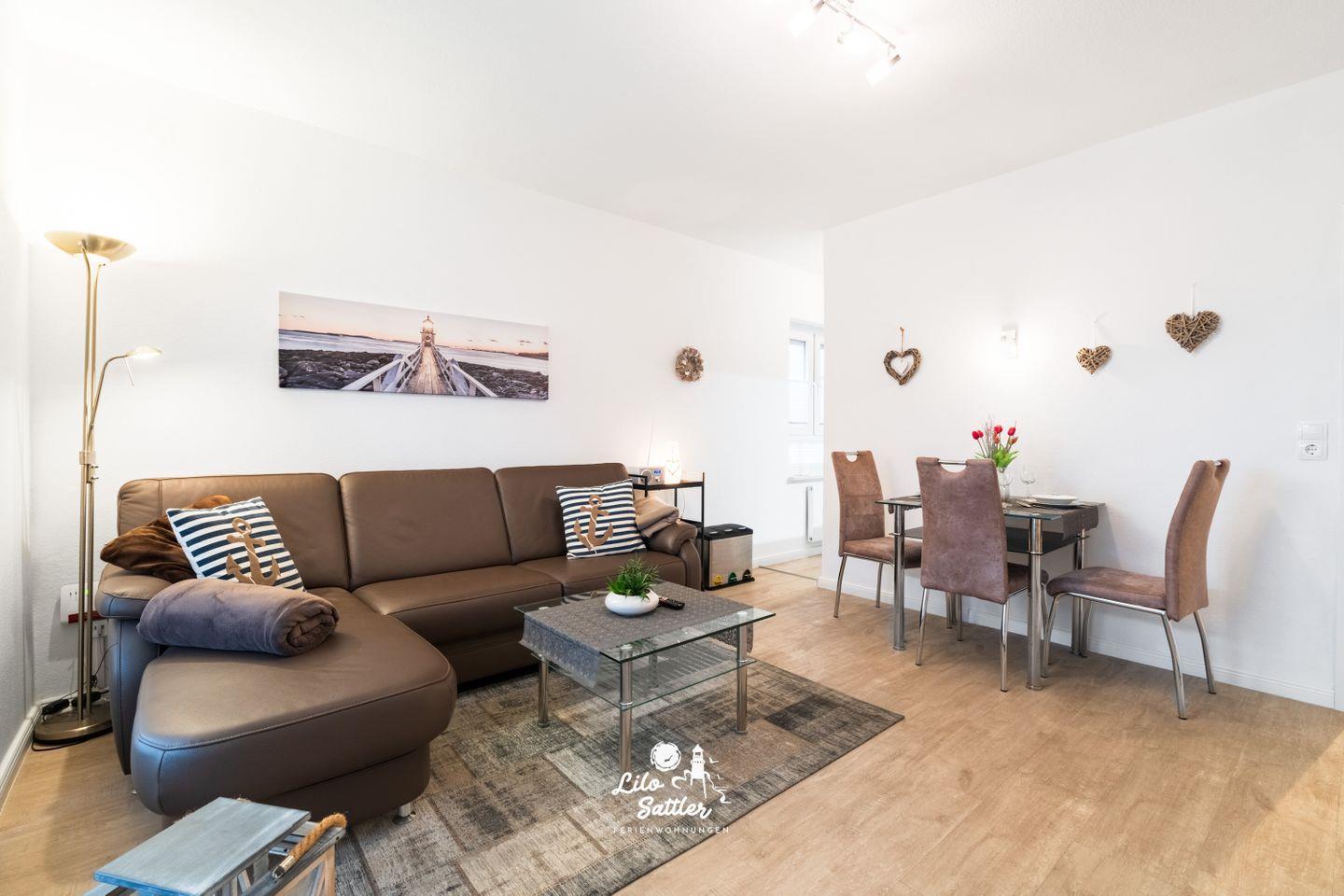 Willkommen in unserer modernen Ferienwohnung, die ideal für bis zu drei Personen ist und sich über eine großzügige Fläche von 50 qm erstreckt. Der Wohnraum ist geschmackvoll und gemütlich eingerichtet und unterteilt sich in ein einladendes Wohnzimmer mit einem Essbereich sowie einer gut ausgestatteten Küchenzeile. Hier können Sie entspannte Abende verbringen und Ihre Lieblingsgerichte zubereiten.