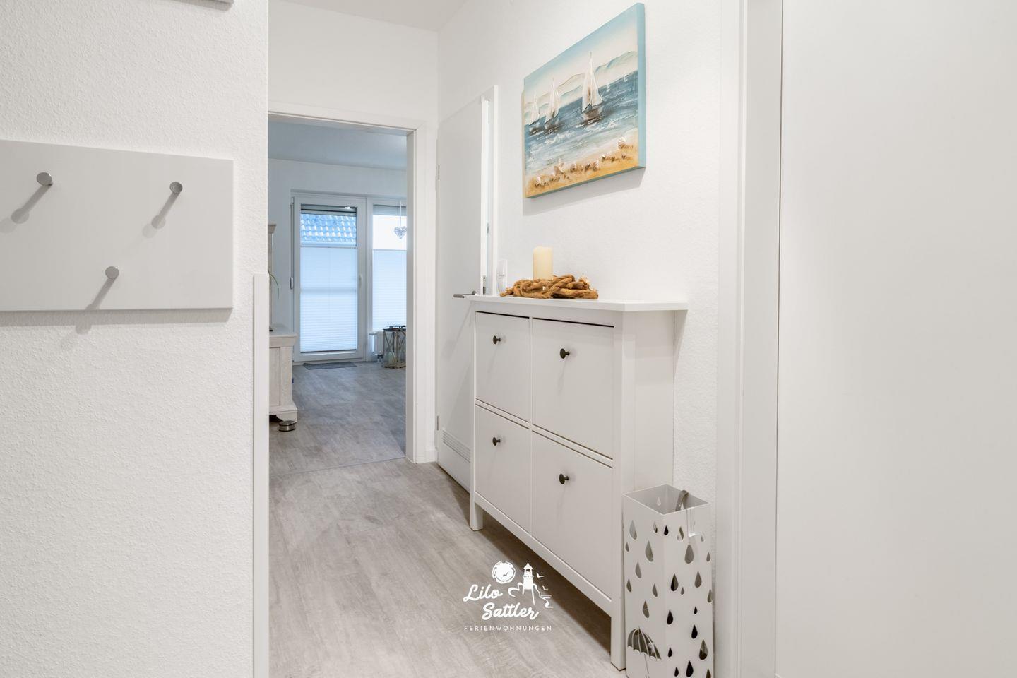 Garderobe, Schuhschrank, Terrasse mit Markise, W-Lan, 1 kostenloser Parkplatz, Bettwäsche und Handtücher, optional buchbar, Nichtraucher, Fahrradabstellplatz, Rauchmelder, Sichtschutz und Fliegengitter für alle Fenster