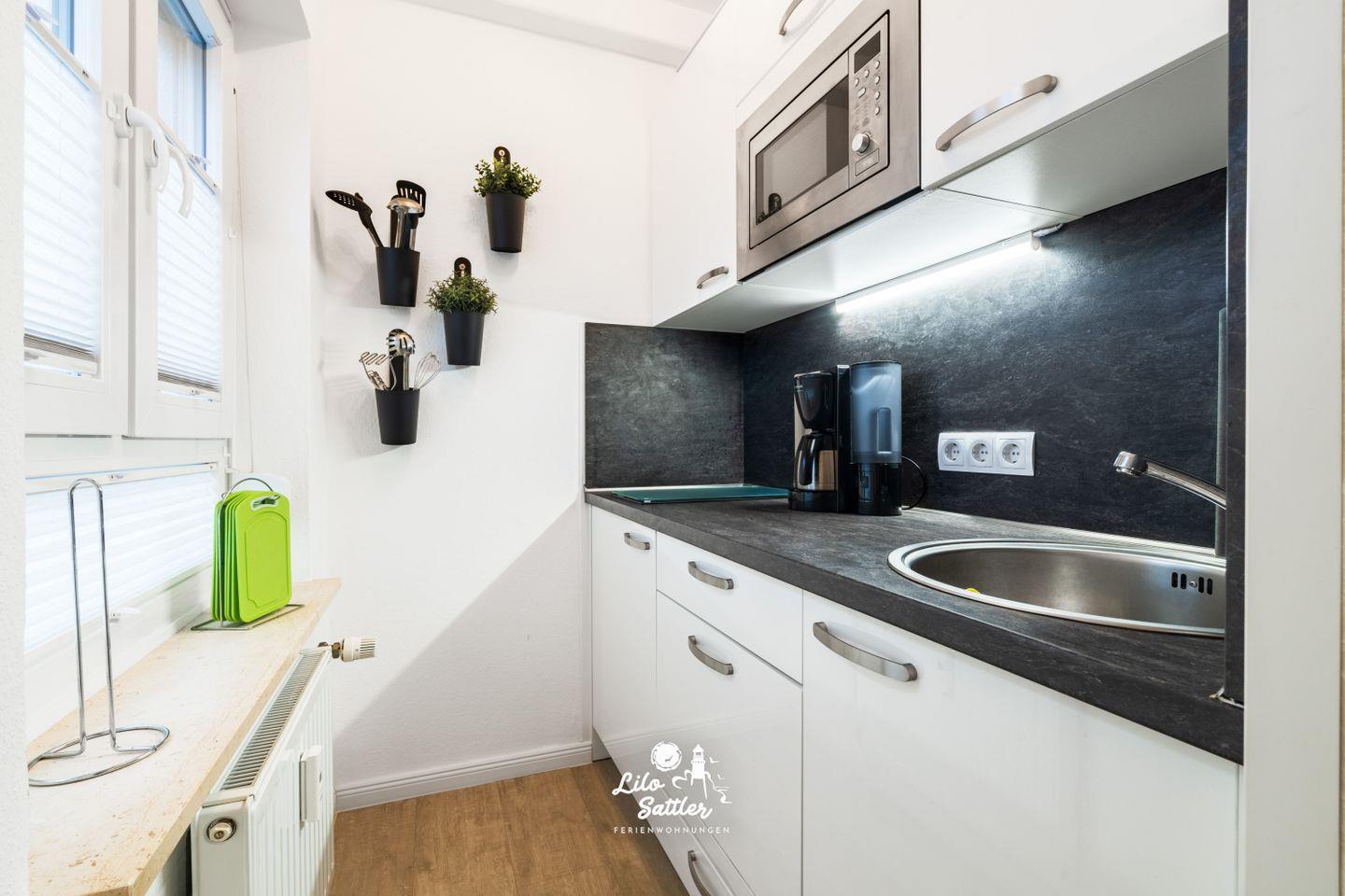 Ceranfeld mit zwei Kochfeldern, Kühlschrank mit Gefrierfach, Mikrowellen-Grill Kombi, Geschirrspüler, Kaffeemaschine, Wasserkocher, Toaster