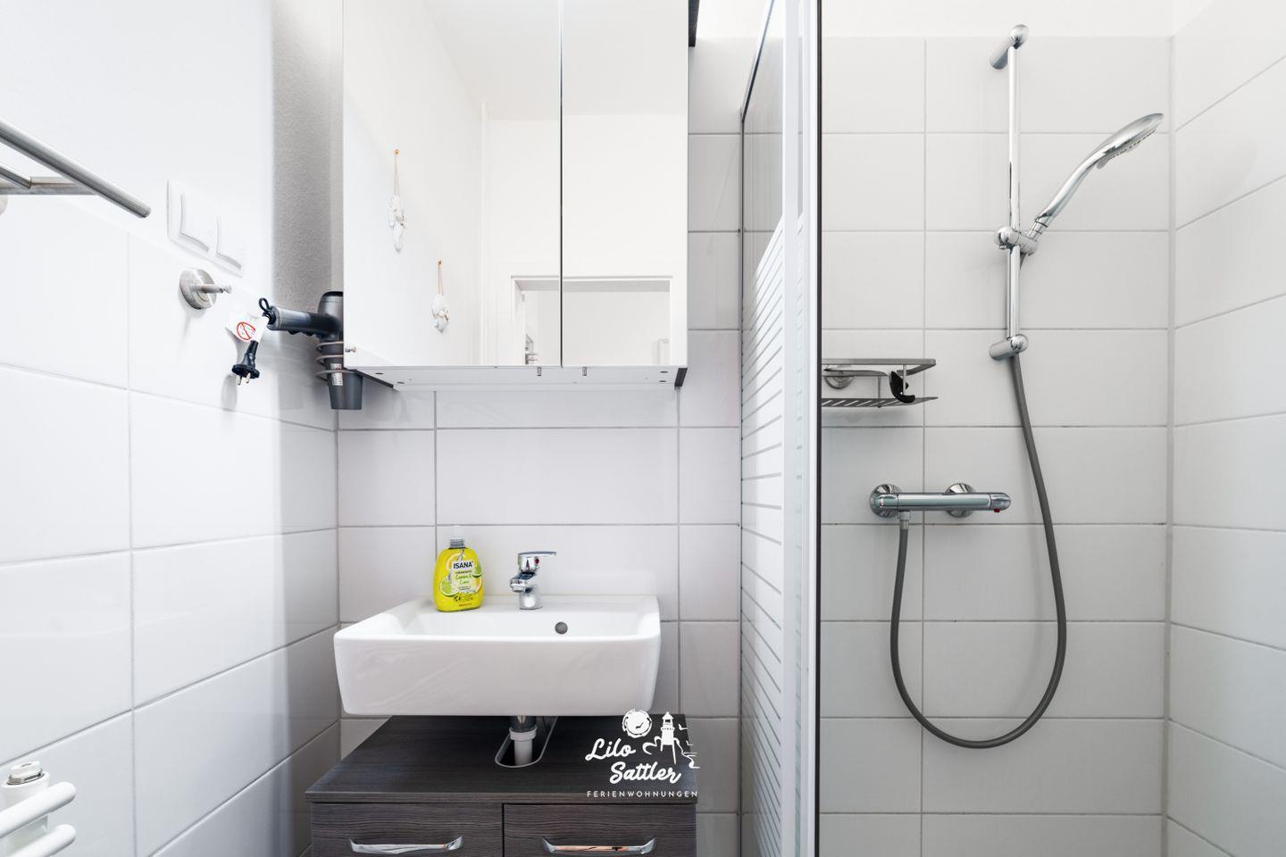 Dusche, Waschbecken mit Unterschrank, Spiegelschrank, WC, Handtuchwärmer, Föhn, Lüfter