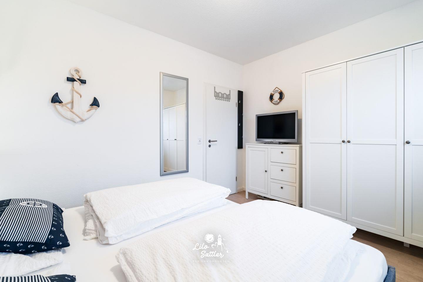 Die beiden Schlafzimmer sind komfortabel gestaltet und verfügen jeweils über einen Fernseher, sodass Sie auch im Urlaub nicht auf Ihre Lieblingssendungen verzichten müssen. Alle Räume sind mit Rollläden und Fliegenschutzgittern ausgestattet, was für zusätzlichen Komfort sorgt.